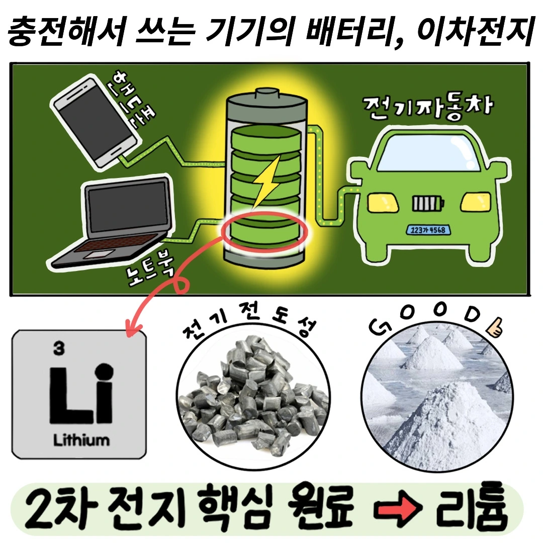 그리고 이 이차전지를 구성하는 주된 핵심 원료가 바로 "리튬"이라는 광물입니다. 리튬은 가볍고 전기전도성이 좋아서 배터리를 만들 때 최적이라고 해요.