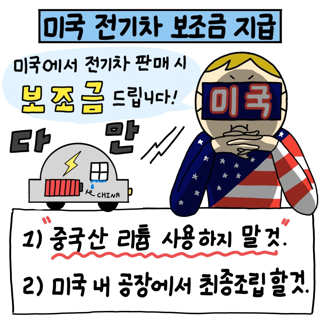 그런데 이 보조금을 받기 위해선 무조건 지켜야 할 조건이 있는데, 바로 중국산 리튬은 절대 사용하지 말 것, 그리고 미국 내 공장에서 최종 조립해서 판매하라는 것입니다. 이는 미국이 중국을 견제함과 동시에 미국 내 일자리가 늘고, 자국의 제조업을 살리는 정책입니다.