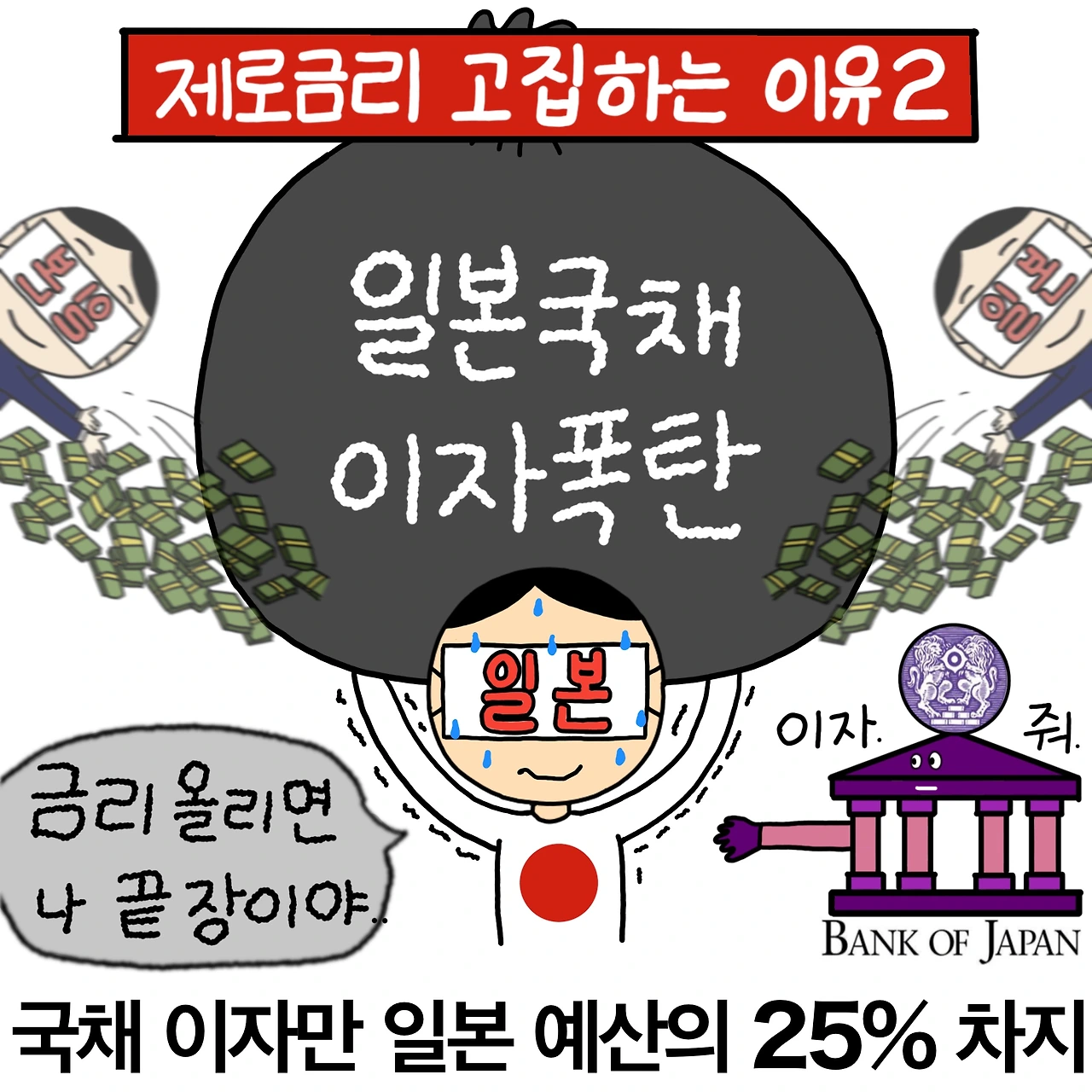 제로금리를 유지하는 이유가 한 가지 더 있는데, 바로 일본 정부가 돈을 계속 찍어내면서, 일본국채 이자만 해도 어마어마하게 늘어났기 때문입니다. 지금도 일본 예산의 25%를 국채 이자 갚는 데 사용한다고 하는데요, 여기서 금리를 더 올리게 되면 이를 감당할 수 없기 때문에 저금리를 유지한다고 합니다.