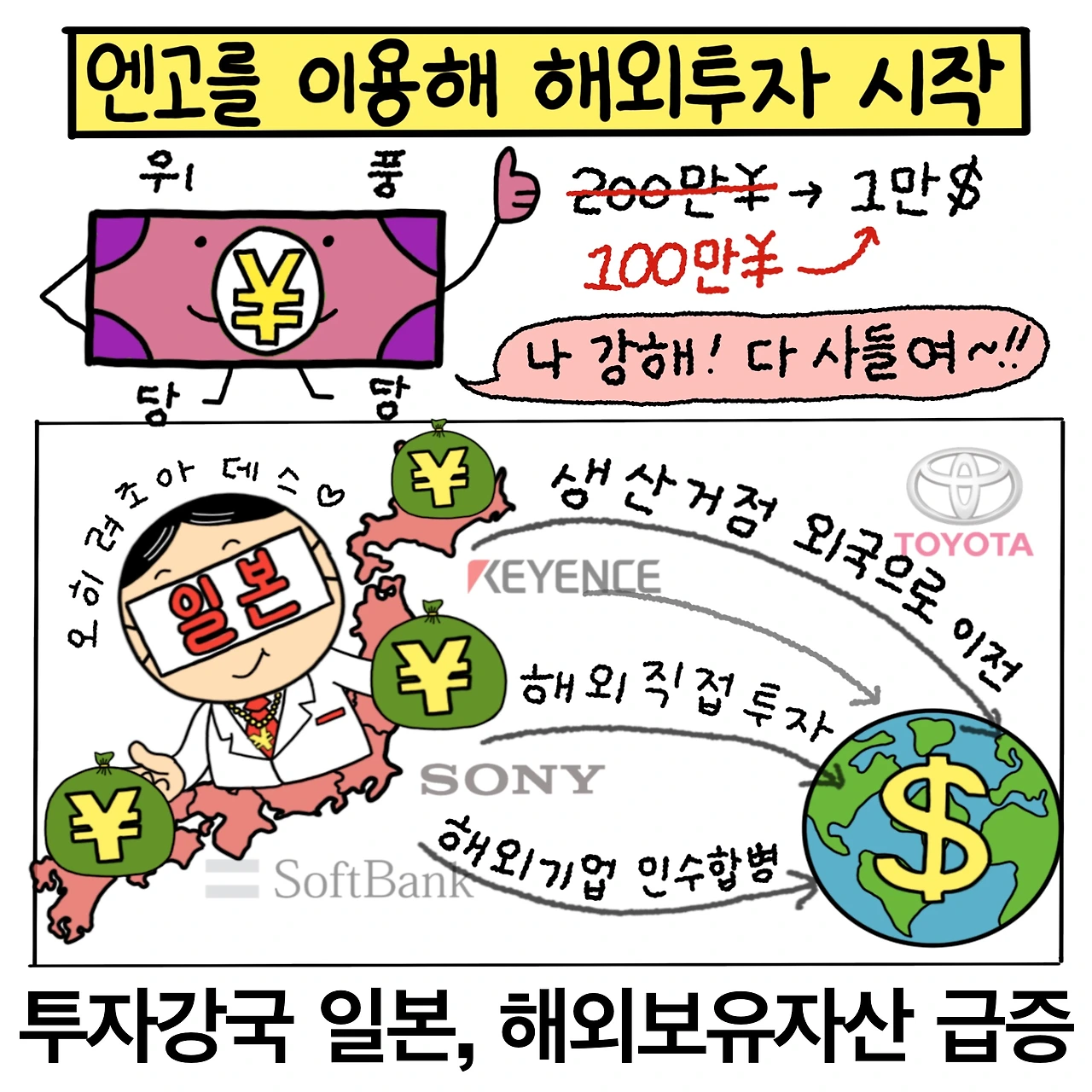 위기를 기회로 바꾸라는 말이 있죠? 일본은 비록 수출은 망했지만, 비싸진 엔화를 활용해 그동안 벌어놨던 돈으로 해외 투자를 시작합니다. 1만$로 바꾸려면 원래 200만 엔이 필요했는데, 이제는 100만 엔만 있어도 1만$를 바꿀 수 있었죠. 비싸진 엔화를 활용해서 전 세계로 나가게 됩니다.