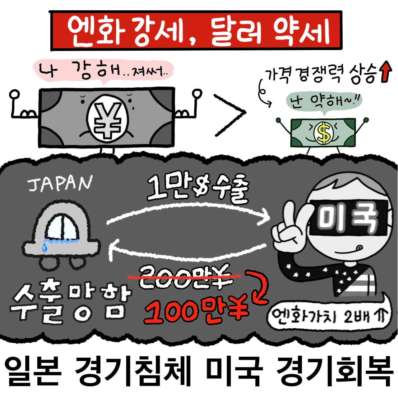 환율은 어려우니까 조금 천천히 살펴볼까요? 플라자합의를 통해 엔화 가치가 달러의 2배로 뛰면서 엔고로 바뀌었습니다. 1만$를 수출하면 원래는 200만 엔으로 바꿀 수 있었는데, 엔화가치가 뛰는 바람에 100만 엔만 바꿀 수 있게 된 것이죠. 일본이 원래대로 200만 엔을 벌기 위해선 미국에 수출하는 가격을 2배로 올려야 했죠. 일본은 가격경쟁력을 잃어서 수출이 망해버려 경기침체 된 반면 미국은 달러 약세로 인해 경기회복을 하게 됩니다.