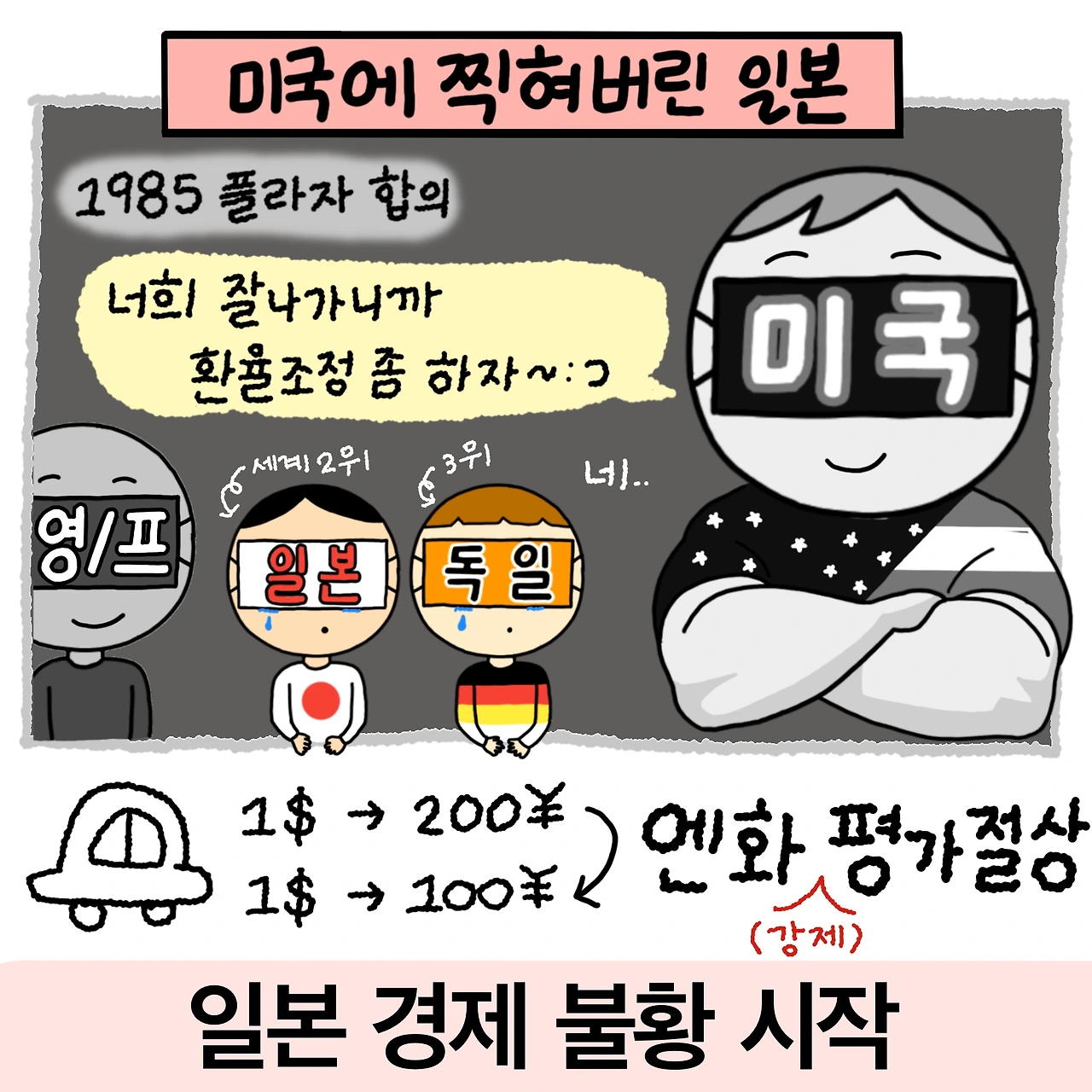 이는 즉 미국이 외환시장에 개입해서 환율을 인위적으로 조정해, 엔화와 마르크화를 강제로 비싸게 만들어서 수출을 제재한 것입니다. 이때부터 일본은 가격 경쟁력을 잃어 수출이 망해버렸고, 경제 불황이 시작되게 됩니다.