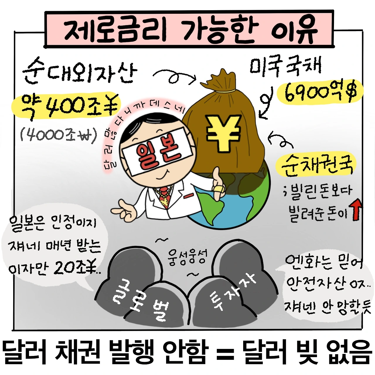 엔화는 안전자산으로 인정받는 준기축통화이기 때문에, 자본력을 믿고 큰 리스크를 감당할 여유가 있던 것입니다. 그래서 일본은 무조건 디플레이션을 잡아 경제 활성화를 시키기 위해서 제로금리를 유지하고 있습니다. 한국은 자본이 부족해서 외국인 투자금 탈출이 큰 위험이 되는데요, 일본은 투자해 놓은 돈이 많아서 어느 정도 달러탈출을 감당하면서 저금리를 유지하는 것입니다.