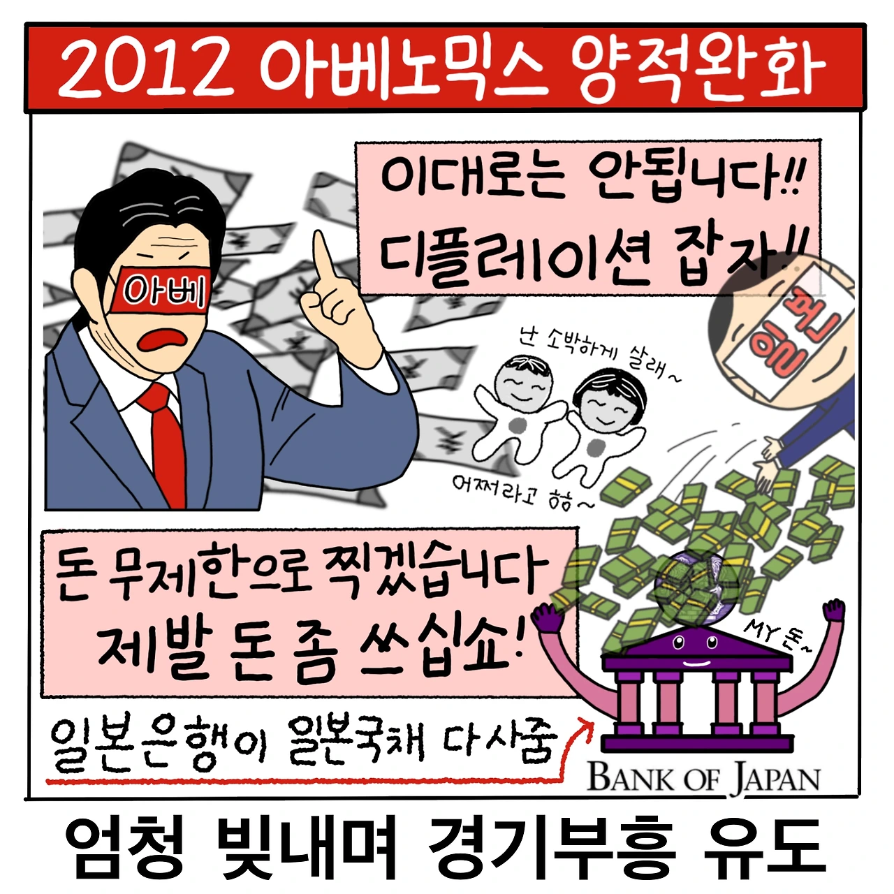 그렇게 장기 경기침체, 디플레이션이 이어지다가 2012년 아베 신조의 정책이 시작됩니다. 아베는 무조건 일본의 디플레이션을 잡겠다, 일본 경제 재건을 목표로 무제한 양적완화를 하겠다고 공표합니다. 위의 인용구는 아베노믹스의 가장 유명한 말이라고 하는데요, 윤전기를 쌩쌩 돌린다는 말은, 돈 찍어내는 기계를 계속 돌려서 엔화를 마구 찍어내 시장에 풀겠다는 말입니다.