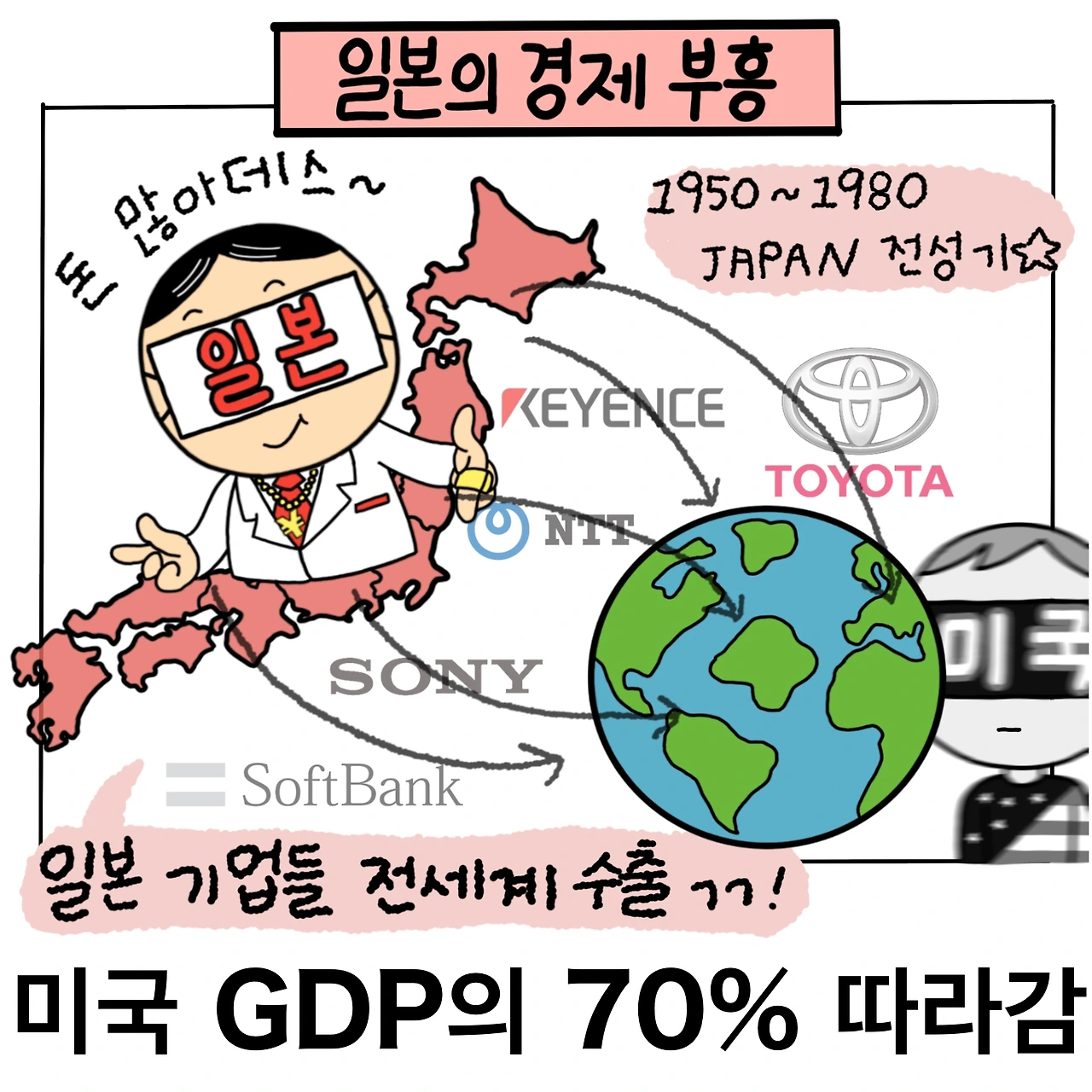 1950년부터 1980년은 일본 경제의 전성기였습니다. 일본 기업들의 엄청난 발전으로 전 세계 수출을 다 잡고 있었죠. 그래서 이때 일본 GDP가 미국 GDP의 70%를 따라갈 만큼 엄청난 돈을 벌어들였습니다.