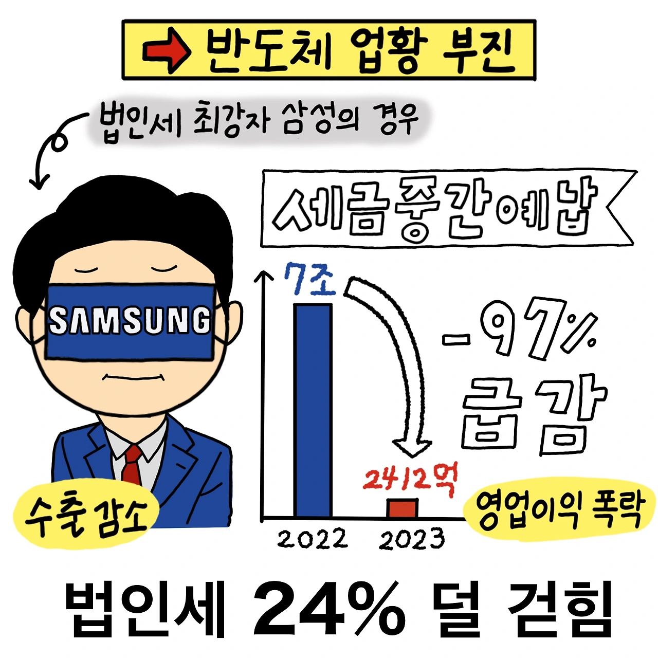 법인세의 20%를 차지한다던 법인세 최강자 삼성의 경우, 세금 중간 예납을 살펴보면 2022년에는 법인세로 7조를 냈지만, 이번엔 97%나 급감한 2412억 밖에 내지 못했다고 하죠. 영업이익이 폭락해서 법인세가 약 24%나 덜 걷혔다고 합니다.