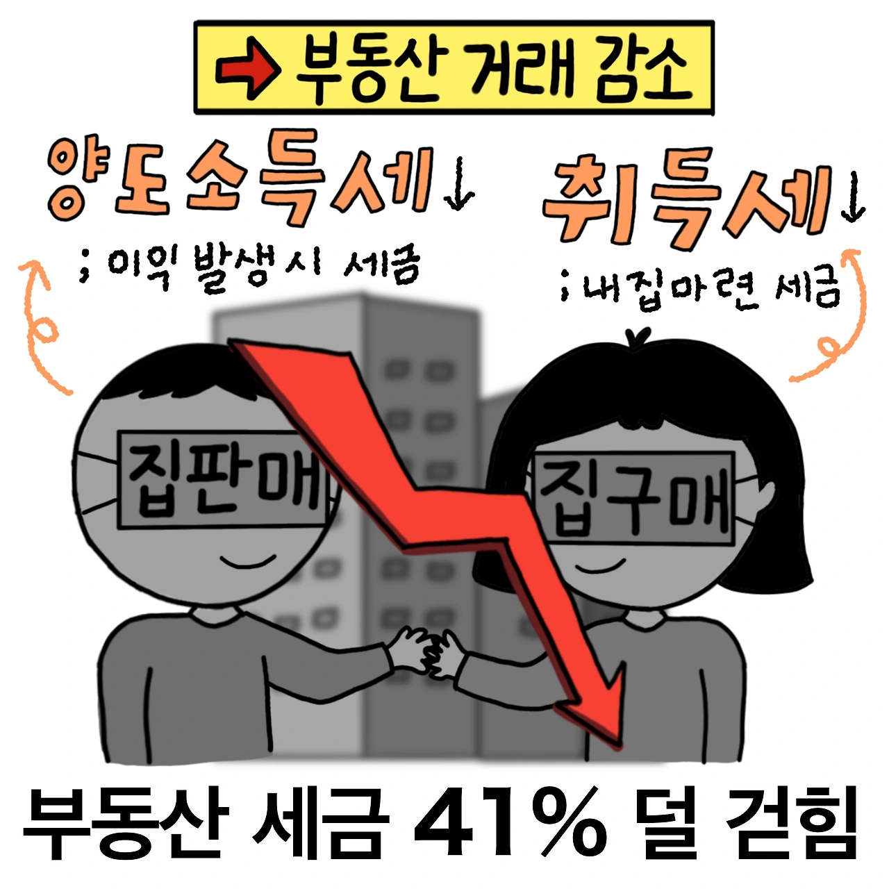 다양한 이유가 있겠지만, 큰 원인 중 하나는 금리인상에 따른 부동산세 감소에 있습니다. 미국이 인플레이션을 잡기 위해 금리 인상을 하게 되면서, 한국도 눈치 보며 따라 올리고 있는데요, 금리(이자율)가 오르면서 소비가 위축되고 부동산도 큰 타격을 입게 되었습니다. 부동산 불황에 따라 부동산 거래 역시 감소하게 되었는데요! 그러다 보니 부동산을 거래할 때 내게 되는 "양도소득세", "취득세"등 부동산 세금이 약 41%나 덜 걷히게 되었다고 합니다.