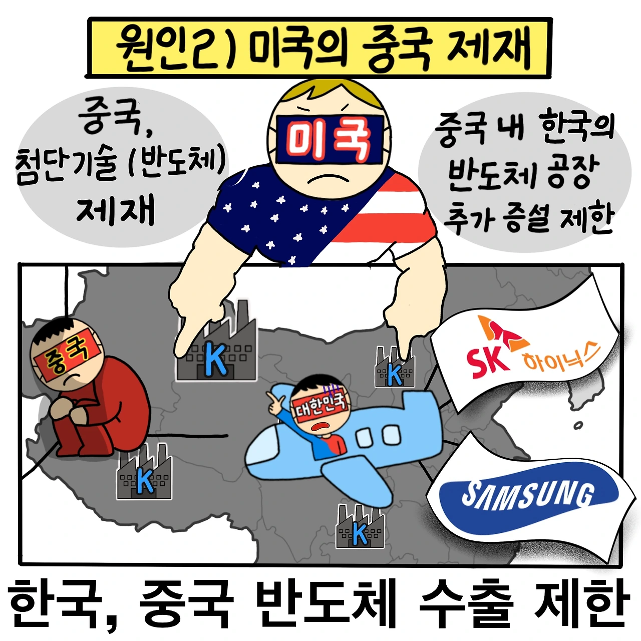 두 번째 중요한 원인은 반도체 업황 부진에 따른 법인세 감소입니다. 계속되는 미국의 중국 제재에, 중국에 많은 양을 수출하는 한국 역시 피해를 보고 있는데요, 그중 가장 큰 피해를 입은 품목이 반도체입니다. 미국이 중국의 "첨단기술 제재"를 하게 되면서, 한국에게도 중국 내 한국의 반도체 공장의 추가 증설을 제한하게 됩니다. 이미 판매하고 있는 건 판매하되, 더 이상 최첨단 기기 들이지 말고, 판매도 하지 말라고 말한 것인데요! 중국에 수출하는 반도체 수요가 줄어들어 반도체 가격이 떨어져서 반도체 업황의 부진이 계속되고 있습니다.