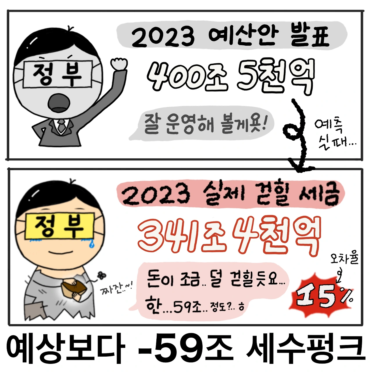 그래서 2023년에 걷힐 세금을 미리 계산해서 '세금을 어디다 쓸지'에 대한 예산안을 계획하게 되는데요! 2023년 예산안을 발표했을 당시에는 "400조 5천억"이 걷힐 거라고 예측했죠. 그러나 막상 2023년 상반기가 지나고 2023년에 실제로 걷힐 세금을 다시 계산해 보니 "341조 4천억" 예산안보다 59조나 부족하게 나온 겁니다. 오차율이 15%나 된다고 합니다. 그렇다면 왜 이렇게 세금이 덜 걷혔을까요?