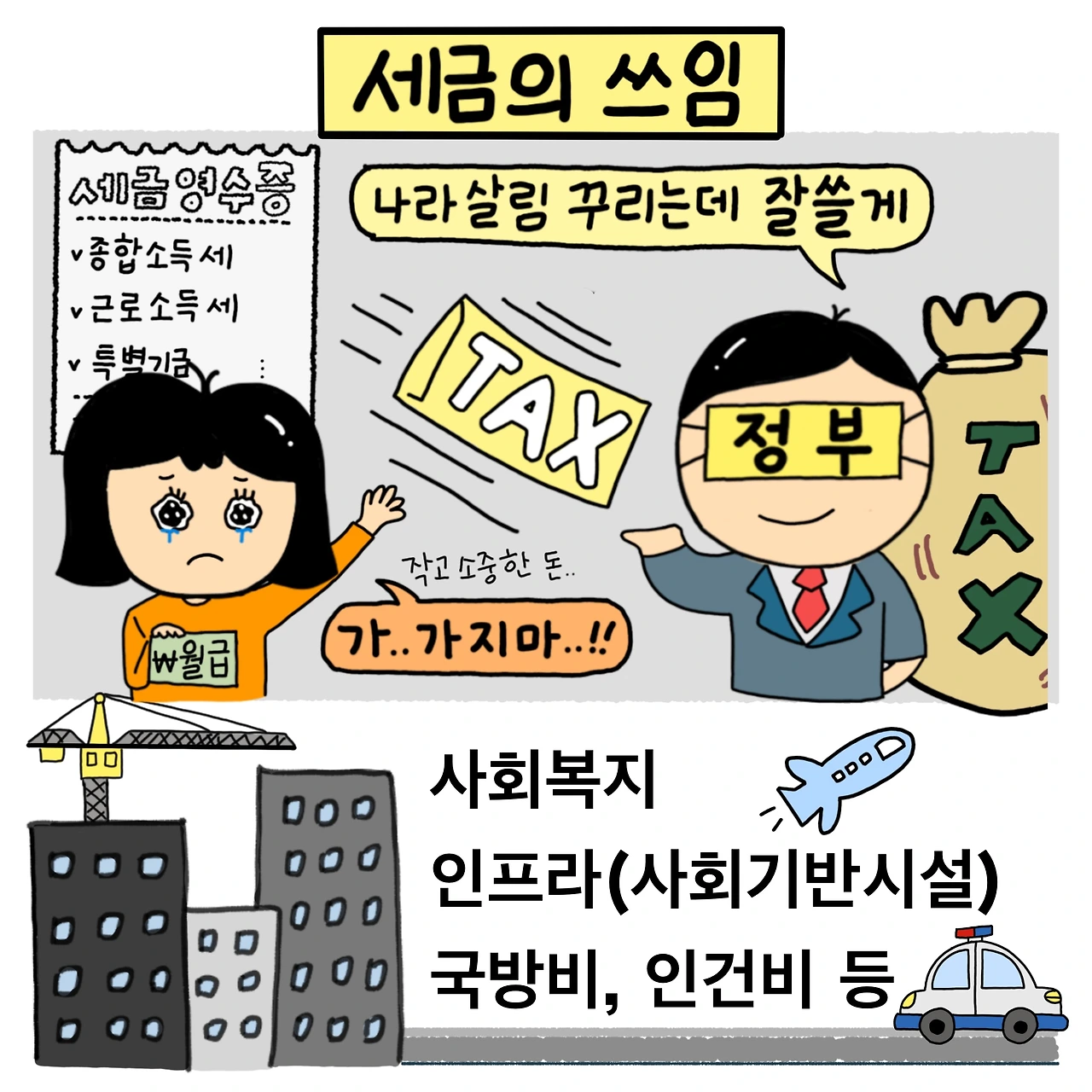 기다리던 월급날, 기다리던 작고 소중한 월급을 받자마자 가차 없이 떼어가는 세금.. 종합소득세부터 근로소득세, 특별기금 등 이곳저곳에 세금을 야금야금 지불하게 되는데요! 나라는 국민들에게 세금을 왜 떼어가는 것일까요? 정부는 1년 동안 나라의 살림을 꾸리는데 필요한 돈을 세금으로 받아갑니다. 그렇게 모은 돈으로 어려운 사람들을 위한 복지 시스템, 사회기반 시설(인프라), 국방비, 인건비 등에 사용하게 되죠!