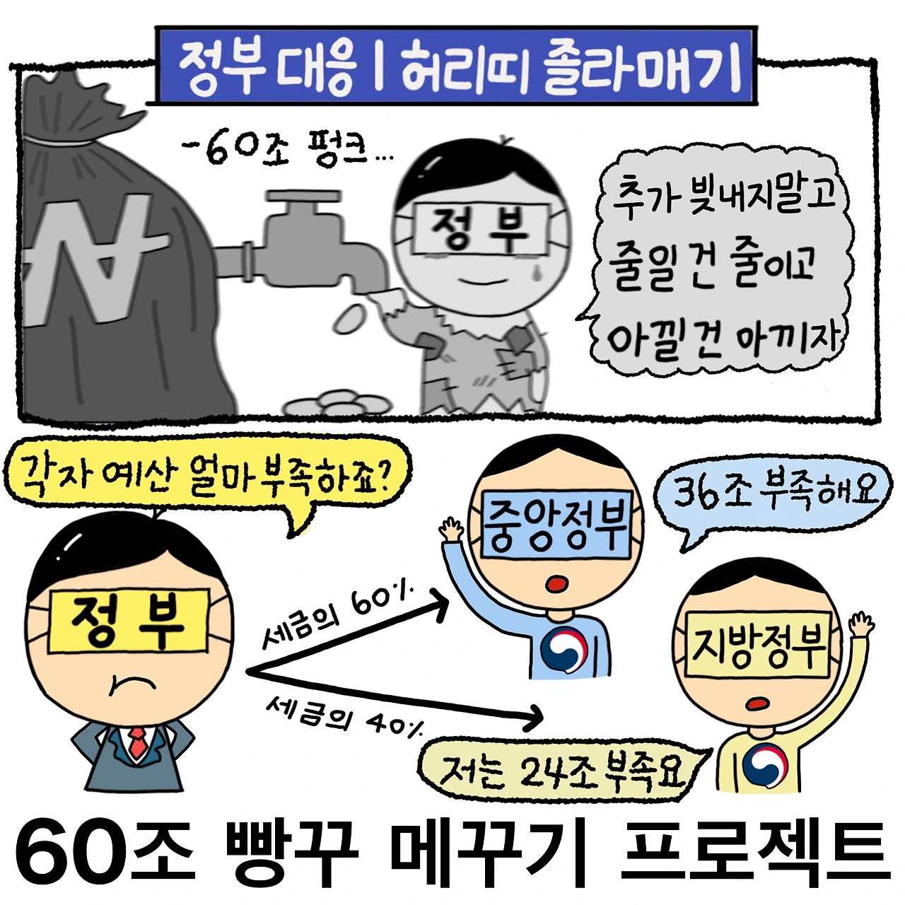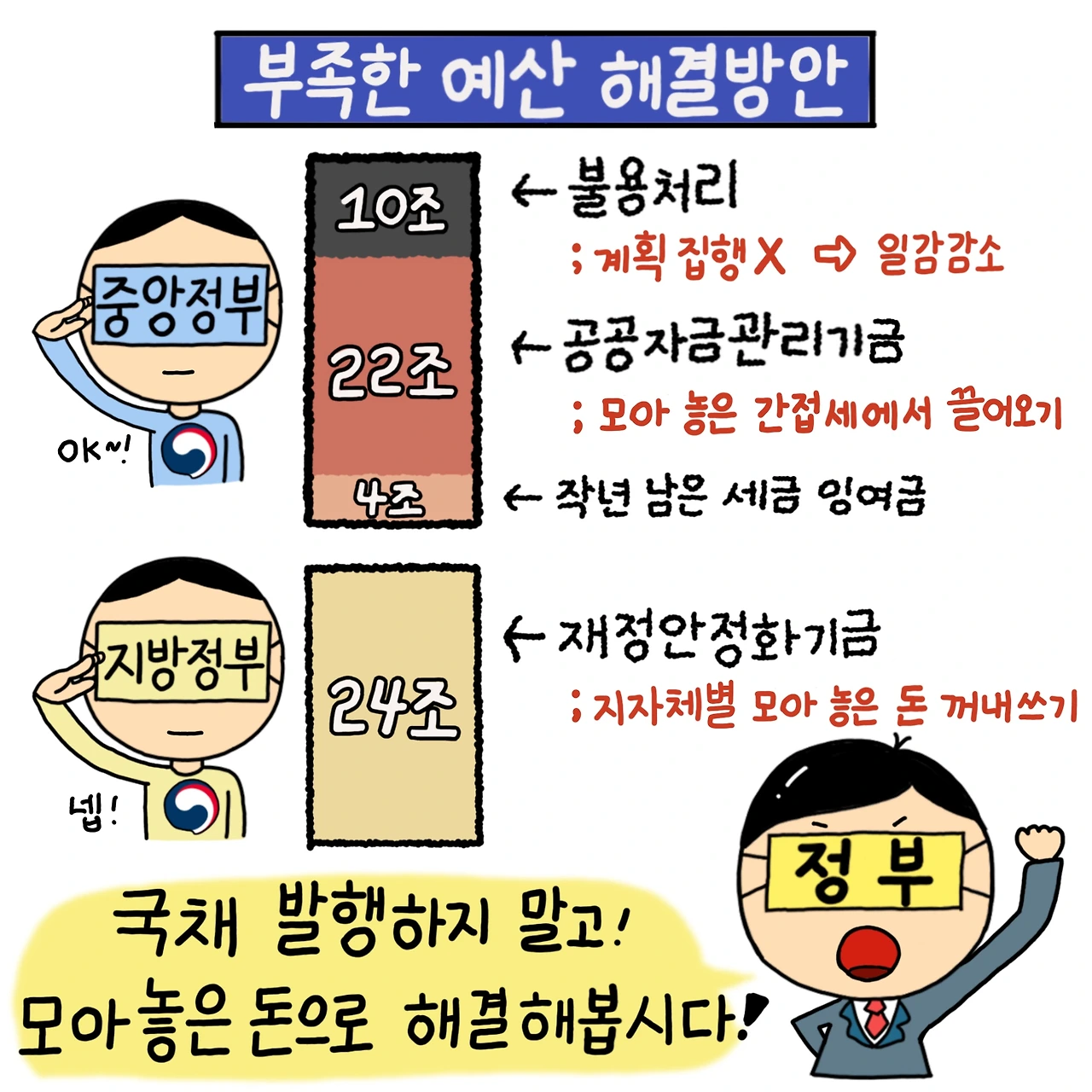 세금의 60%는 중앙정부에게, 세금의 40%는 지방정부에게 분배해서 예산을 계획하게 됩니다. 그래서 중앙정부에서 펑크 난 36조, 지방정부에서 펑크 난 24조의 펑크 메꾸기 프로젝트에 들어갑니다. 중앙정부의 경우 그동안 모아 놓았던 돈(외평기금)에서 끌어와서 메꾸거나, 10조 정도는 불용처리를 하고 일감을 내년으로 미루게 됩니다. 지방정부 역시 그동안 모아 놓았던 돈에서 끌어 쓴다고 합니다.