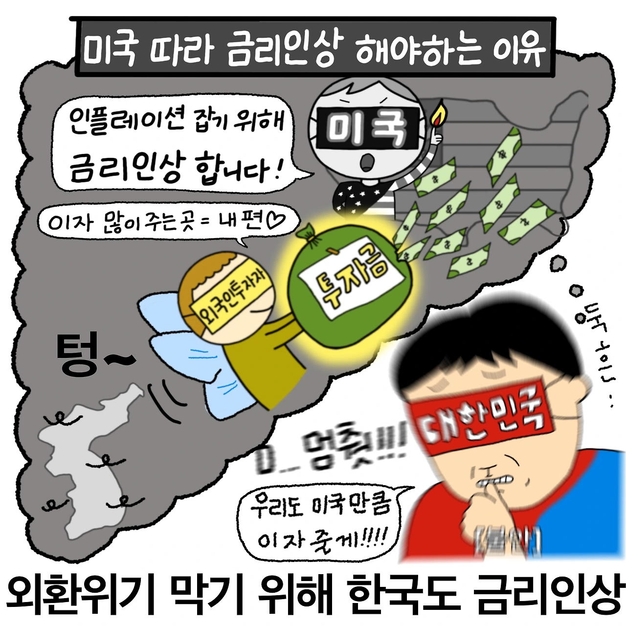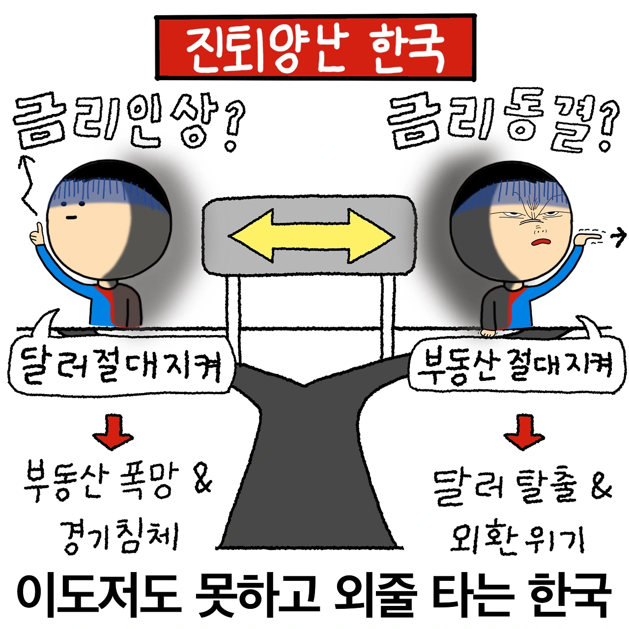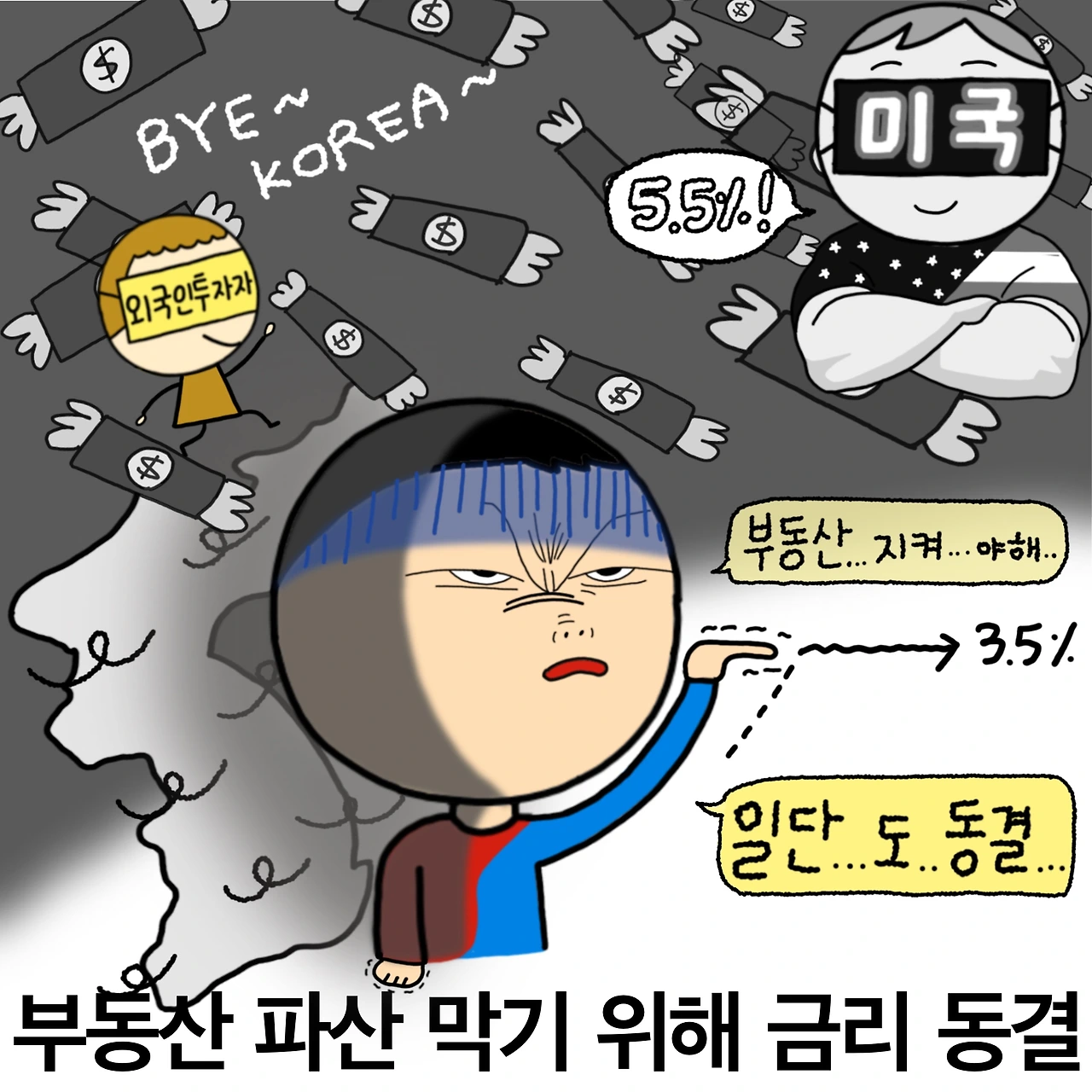 안녕하세요! 오늘은 미국의 금리 인상에 따라 "이도저도 못하는 한국 금리"에 대해서 공부해 봤습니다. 현재 한국은 3.5%까지 금리를 인상시키고 금리 동결 중입니다. 미국은 5.5%까지 금리를 인상시키고 아직은 다행히 금리동결을 하고 있는데요, 왜 한국은 미국처럼 금리를 확 올리지도, 일본처럼 금리를 내리지도 못하고 안절부절못하고 있는 걸까요?