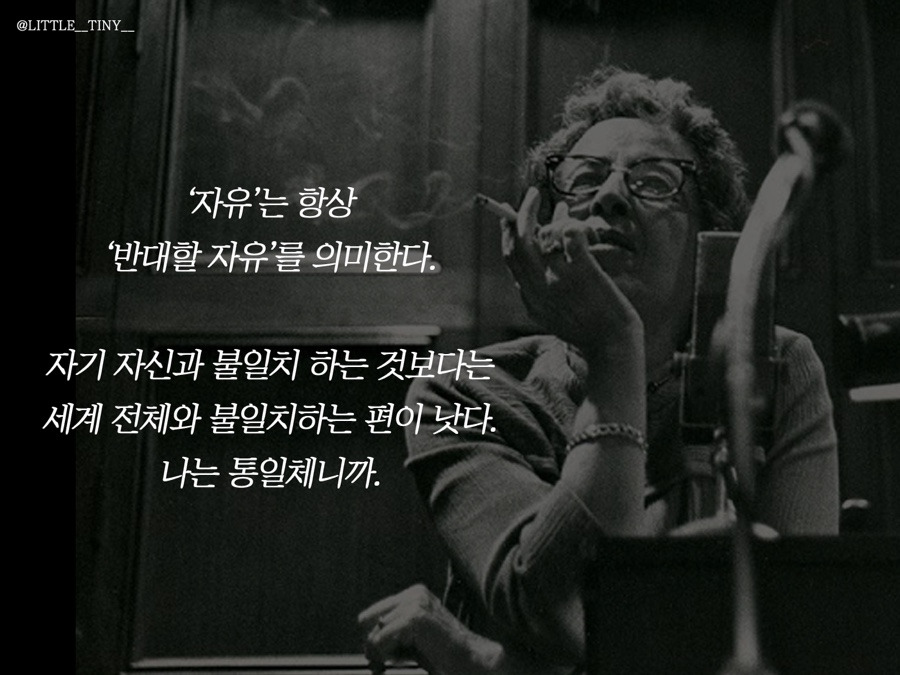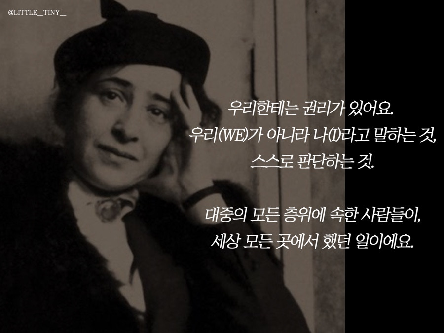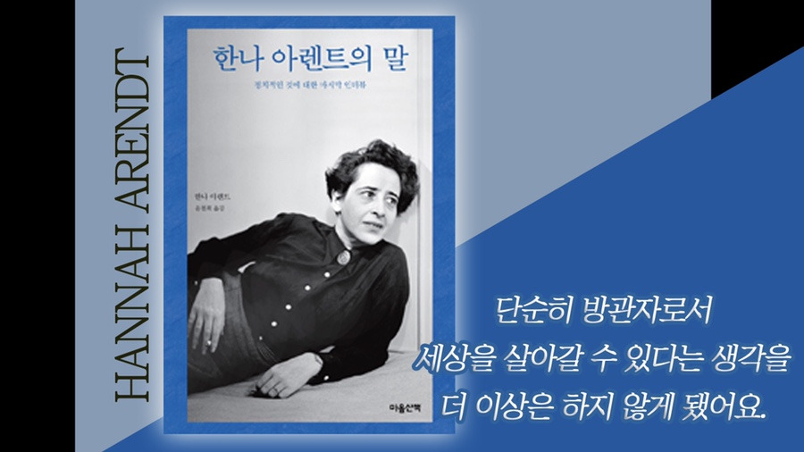 그렇기에 우리는 ‘남’의 생각이 ‘나’의 생각인 양 끌려다니지 않고, 끔찍한 일이 반복되지 않게 하기 위해, 아렌트의 단단한 말들에 주목해야 한다. 21세기를 살아가는 내가 해야 할 정치적 사유란, 작은 선동에 쉽게 끌려가지 않고 객관성을 유지하는 것이 아닐까. 세상 돌아가는 일에 관심을 갖되, 어느 한쪽으로도 경도되지 않는 것. 세상은 집단의 ‘이익관계’에 따라 움직인다는 것을 깨닫고, 누군가의 주장에 맹목적으로 신뢰하지 않는 것. 세상을 비판적으로 바라보는 것.