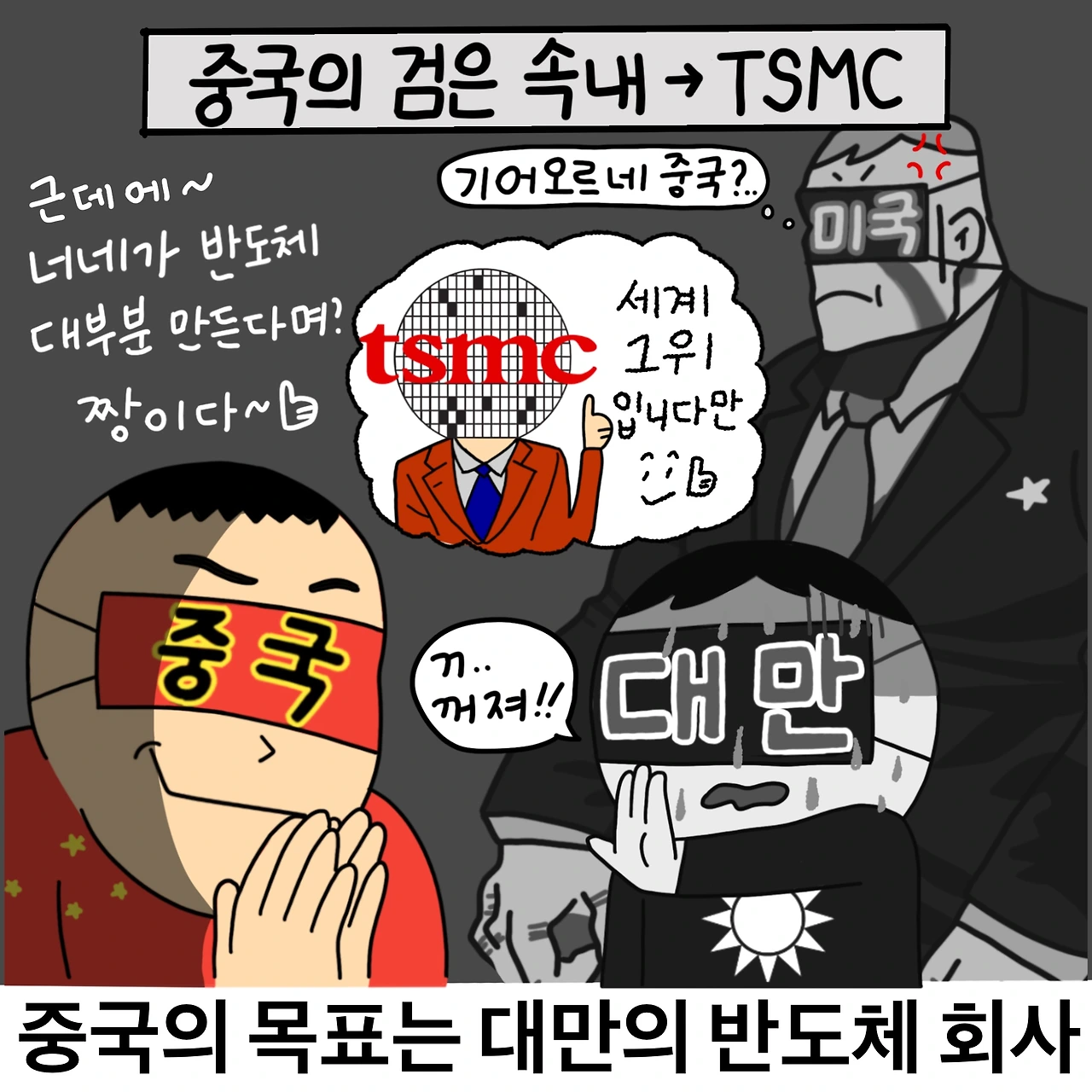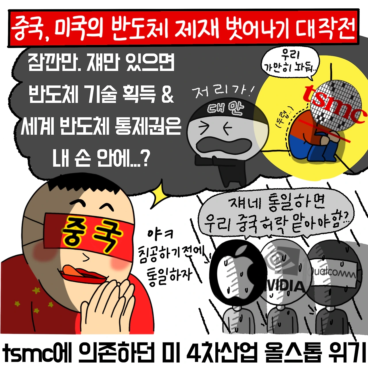 중국은 미국의 강력한 반도체 제재를 받고 있는데요! 미국은 중국을 누르기 위해 중국이 첨단산업에 뛰어드는 것을 모조리 막아버렸죠. 그런 중국이 반도체 산업에 뛰어들 수 있는 가장 확실한 방법이 바로, 대만과 통일해 세계 1위 반도체 파운더리 기업인 TSMC를 자기 손안에 쥐는 것이었죠.