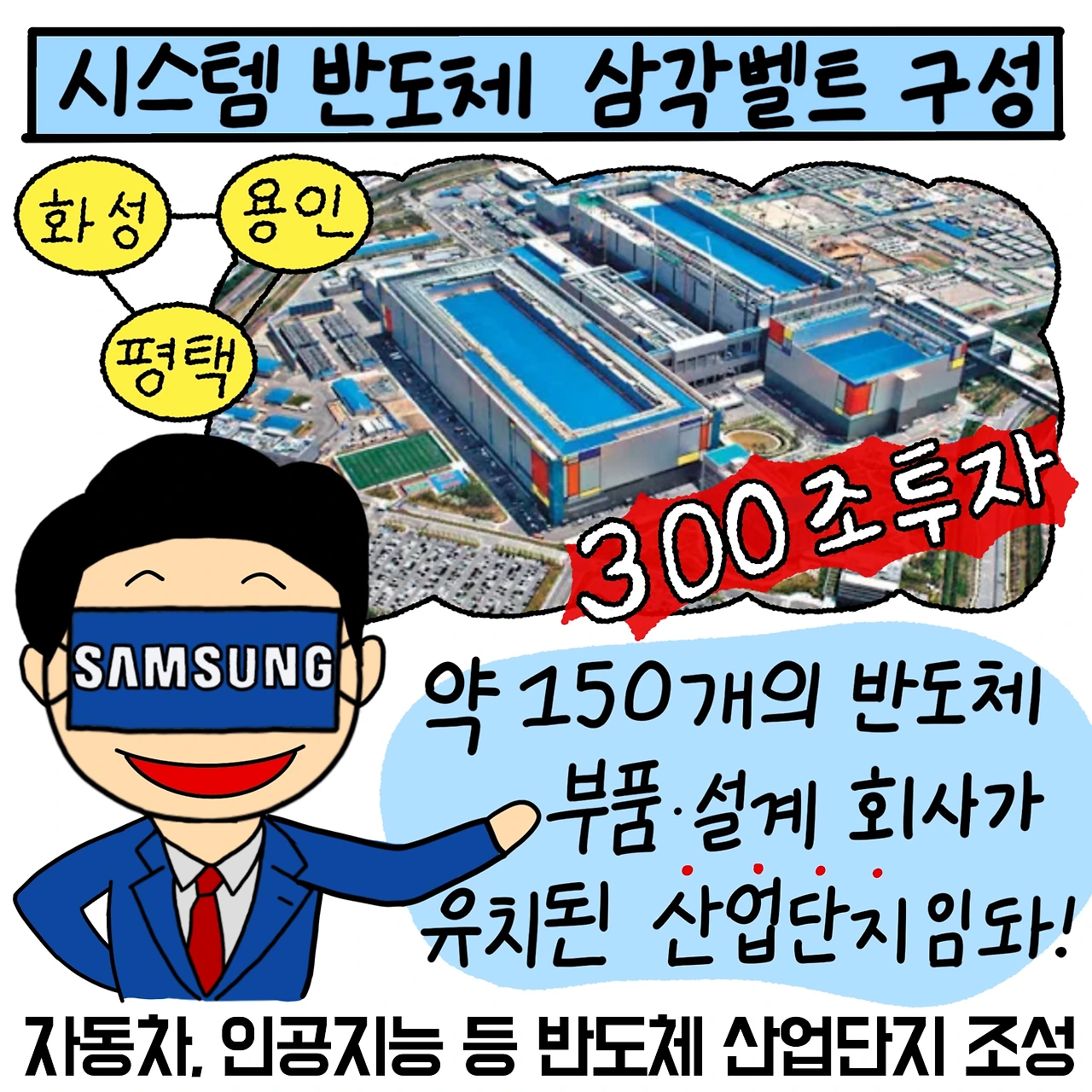 삼성은 300조를 투자해 화성, 용인, 평택에 시스템 반도체 삼각벨트를 구성하고 있습니다. 약 150개의 반도체 부품/설계 회사를 유치시킨 반도체 산업단지를 조성 중입니다. 자동차 반도체, 인공지능 등의 시스템 반도체를 생산할 것이라고 합니다.