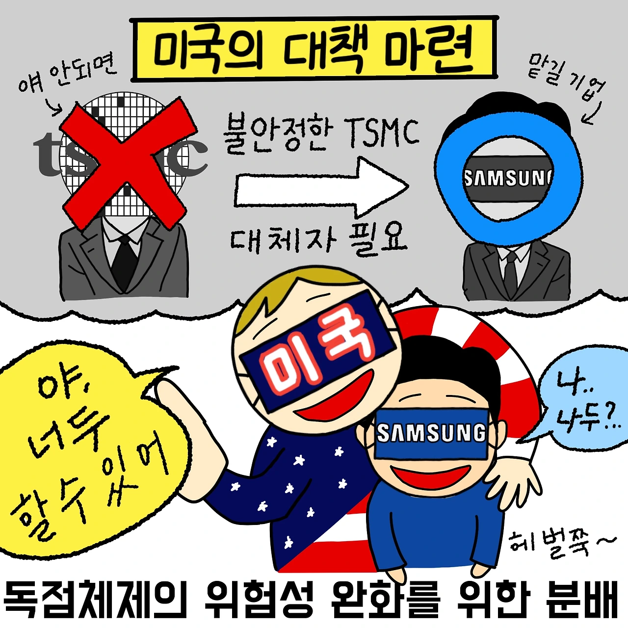 호시탐탐 대만을 노리는 중국의 위협을 대비해, 미국은 불안정한 TSMC의 대체자가 필요했는데요, 그 대체자 명단에 오른 기업이 바로 삼성과 하이닉스입니다. 삼성은 메모리 반도체는 전 세계 1위이지만, 비메모리 반도체의 점유율은 낮았는데요, 삼성도 더욱 적극적으로 시스템반도체 생산에 나서게 됩니다.