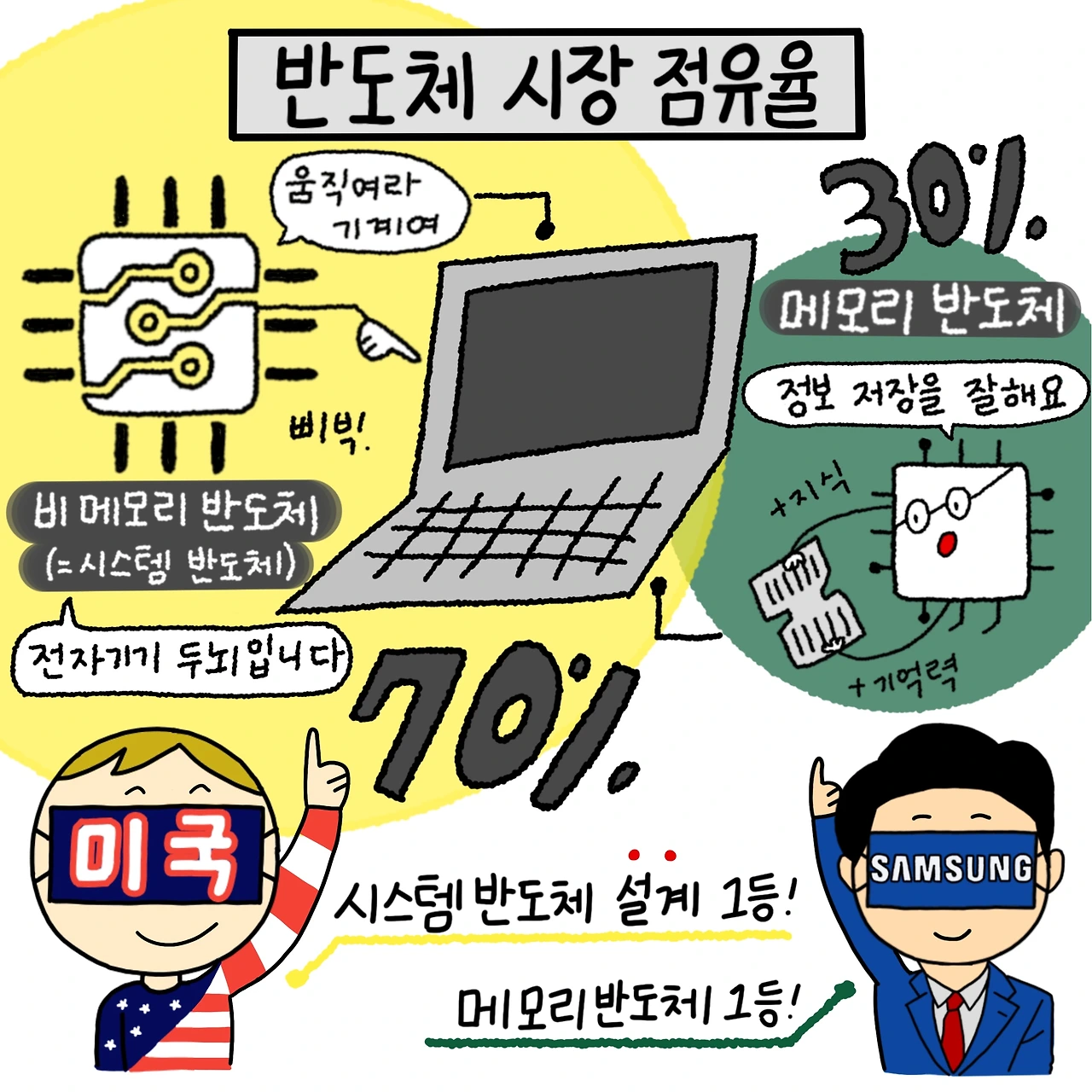 반도체 시장은 크게 두 가지 부류로 나뉩니다. "메모리반도체"와 "비 메모리 반도체(시스템 반도체)"