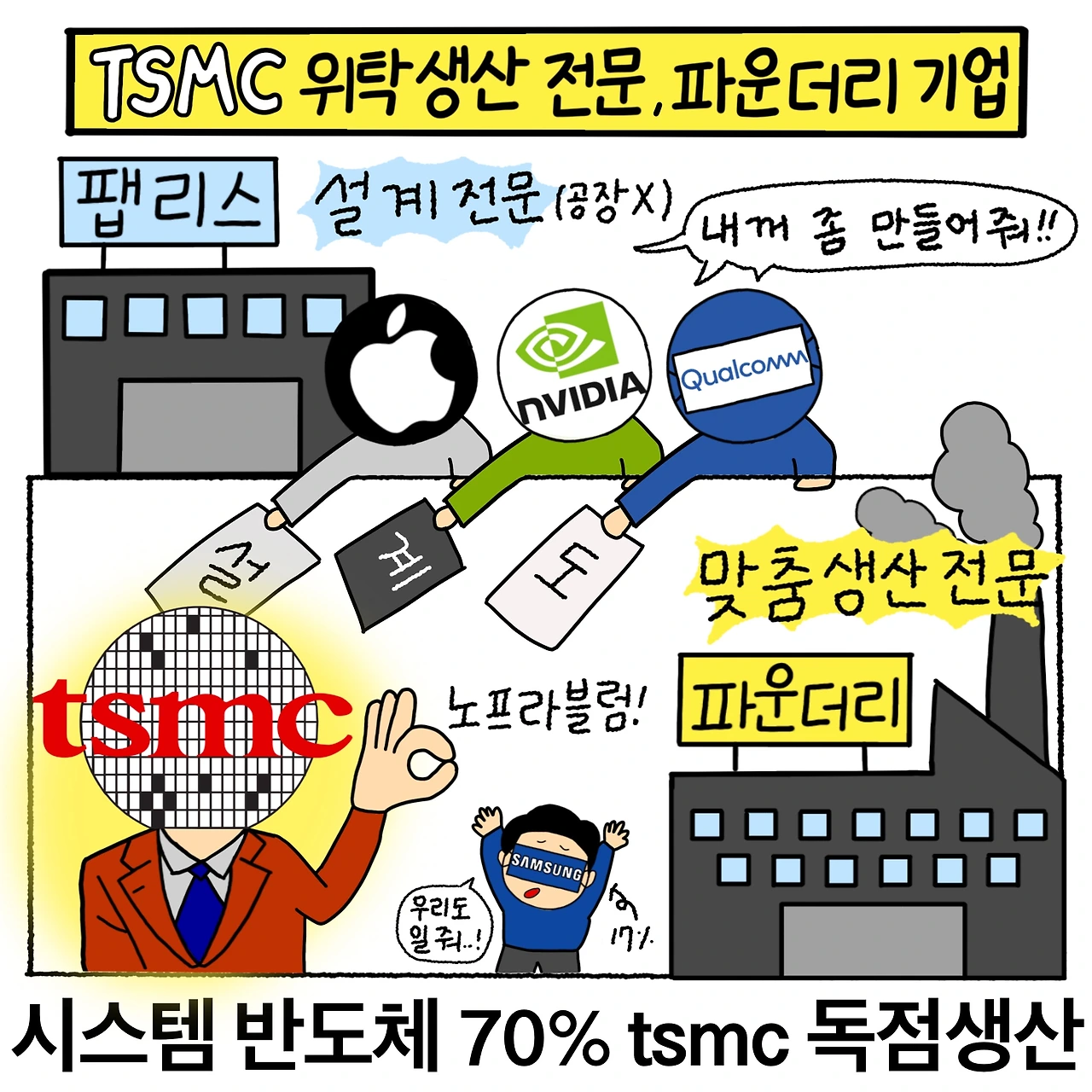 미국의 4차 산업에 종사하는 대기업(애플, 엔디비아, 퀄컴 등등)들은 대부분 "시스템 반도체 설계만 하고, 직접 제조는 안 하는 팹리스 기업"입니다. 설계를 완벽하게 해낸 후, 그 설계도를 "반도체 위탁생산 전문 업체인 파운더리 기업"에 제작을 맡기게 되죠. 파운더리 기업은 직접 설계는 안 하고, 제작만 하는 회사입니다. 그리고 파운더리 기업 1등이 바로 대만의 TSMC입니다. 시스템 반도체의 70%를 TSMC가 독점 생산을 해내고 있기 때문에, 미국의 4차 산업도 TSMC에 의존하고 있죠. 엄청난 영향력을 행사하는 회사입니다.