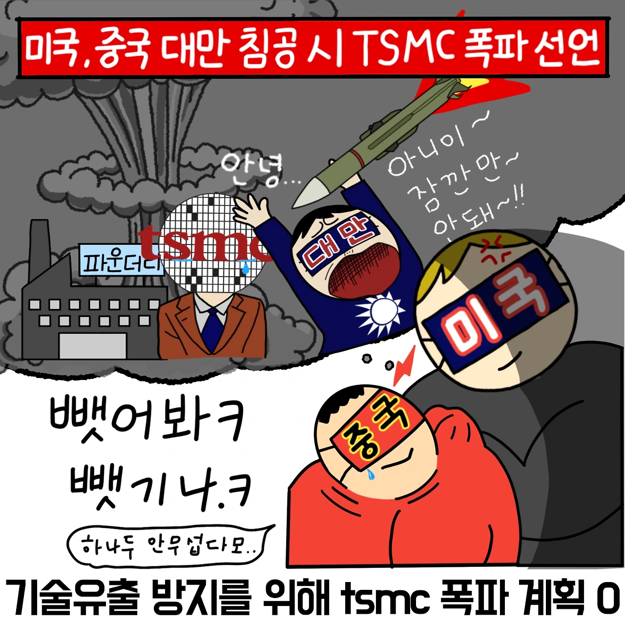 절대 TSMC를 중국에 넘겨줄 수 없는 미국은, 만약 중국이 대만을 침공해 먹으려 한다면, 기술유출 방지와, 반도체 주도권을 뺏기지 않기 위해 TSMC를 파괴할 수도 있다고 이야기합니다. 그도 그럴 것이 미국이 tsmc가 넘어가 중국에 끌려다니는 것을 그저 두고 보고 있진 않을 것 같습니다.