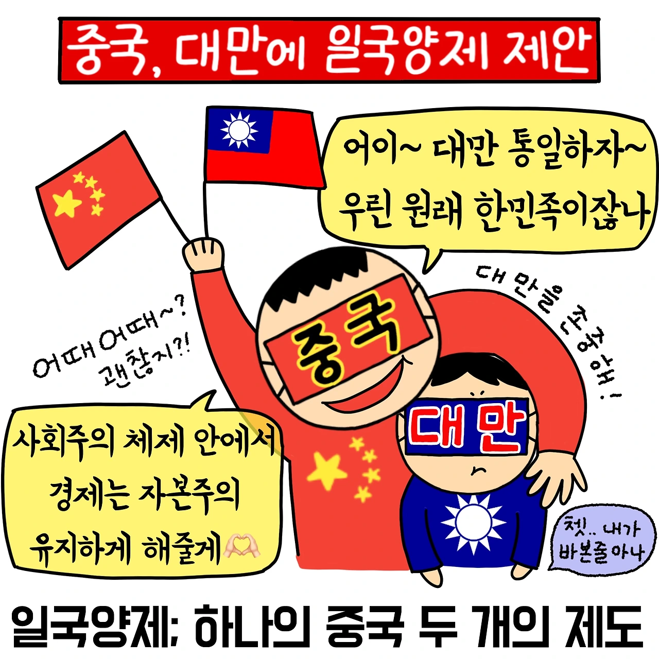 중국은 대만에게 홍콩처럼 "일국양제"를 할 것을 밀어붙이고 있습니다. [일국양제]란 하나의 국가 안에 두 개의 제도를 인정해 주는 것을 말하는데요! "하나의 중국"을 실현하려는 중국이 대만을 중국으로 포섭하기 위한 정책입니다. 현재 홍콩이 중국의 "사회주의 체제" 아래에서 "홍콩기본법"을 따르고 있습니다. 중국은 홍콩처럼 대만도 "중국"이라는 나라 안에 대만의 독립적 체제를 인정해 주겠다며, 일국양제에 따를 것을 밀어붙이고 있죠!