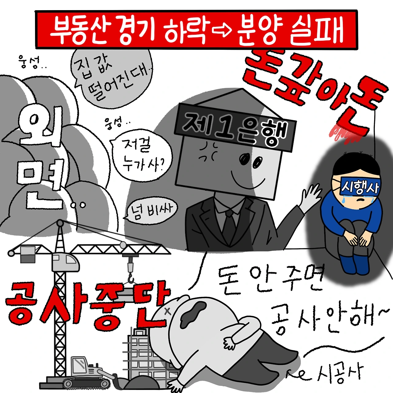 그렇다면 만약 부동산 경기가 갑자기 냉각되면서 프로젝트가 실패하면 어떻게 될까요? 분양이 실패하면 시행사는 그동안 빌리고 빚진 엄청난 돈을 갚을 방도가 사라집니다. 집이 완공되기도 전에 분양을 했는데 실패했을 경우, 시공사는 추후에 돈을 받지 못하기 때문에 공사를 중단하게 됩니다. 시행사는 파산하고, 은행도 큰 위기에 빠지게 됩니다.