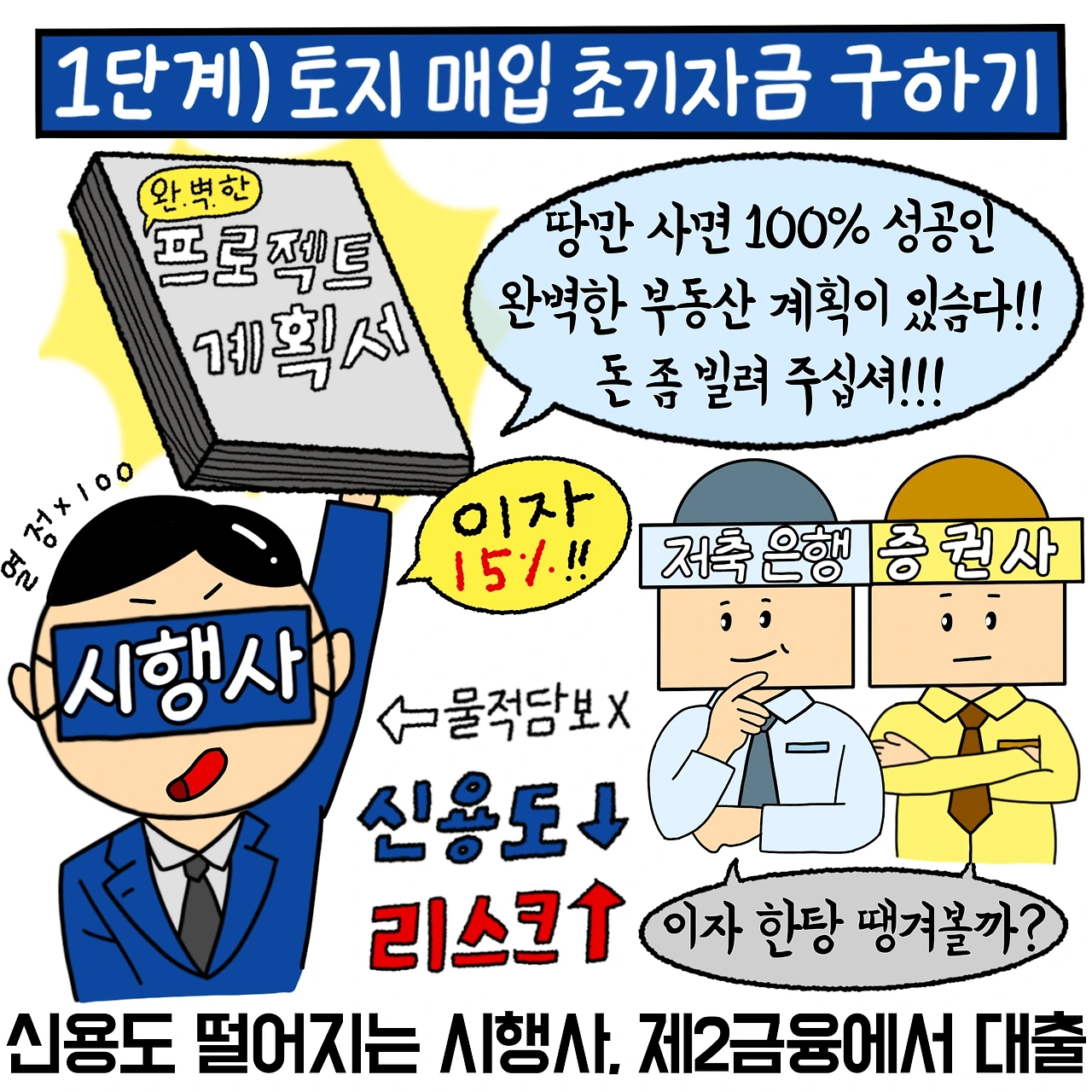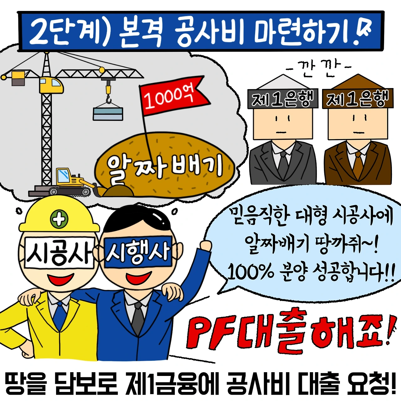 1000억에 알짜배기 땅을 구입한 시행사는 이제 본격 공사비 마련에 도입하게 됩니다. 땅 위에 집을 지어 올려야 하는 만큼 땅 대출보다 훨씬 큰돈이 필요하기 때문에, 이번에는 제1금융(시중 은행)을 찾아가 대출을 요구합니다. 시행사는 함께 시공을 진행할 아주 믿음직한 대형 시공사와 계약을 하고, 시공사와 알짜배기 땅 그리고 완벽한 부동산 프로젝트 계획서를 담보로 시중은행에 찾아가게 되죠. 그리고 이제 집만 세우면 100% 분양 성공! 프로젝트 성공! 할 수 있다며 시중 은행에게 공사비 대출을 요구합니다.