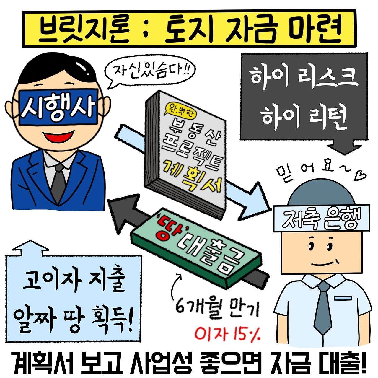 두 결정 사이에서 고민하던 저축은행은, 계획서를 보고 프로젝트의 사업성이 좋다고 판단하여 토지 구입 자금을 대출해 주기로 결정합니다! 시행사는 매달 저축은행에 고이자를 갚아야 하지만, 보다 더 큰 “본격적인 프로젝트 사업”을 시작할 수 있는 기회를 잡게 되죠! 시행사와 저축은행 사이에서 일어난 대출을 “브릿지론”이라고 하는데요! 땅 구입으로 인해 본 사업에 들어갈 수 있는 징검다리 역할을 해준다고 하여 “브릿지론”이라고 말합니다.