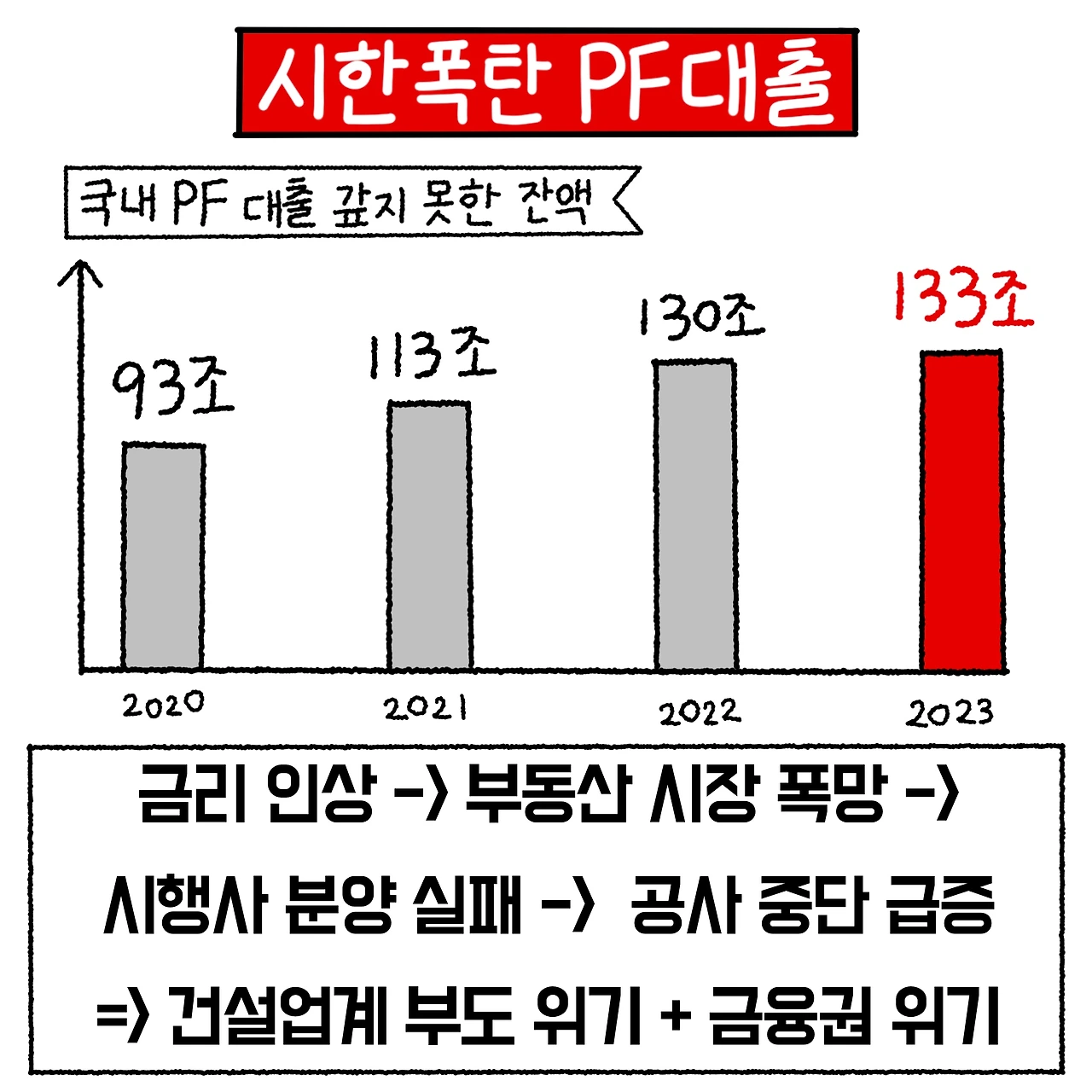 미국의 금리인상이 시작되면서, 한국도 따라서 금리를 인상하게 되었는데요, 미국이 금리를 내려야 한국도 따라 내릴 수 있을 텐데, 미국이 금리를 언제 인하할지 모르는 상황에서 한국의 대출 이자 부담은 계속 높아졌고, 부동산 시장은 한순간에 냉각되었습니다. 부동산 경기가 호황일 때 맺었던 프로젝트들이 한순간 부동산 시장이 냉각되며 중단, 실패하게 되었죠. 부동산 경기 호황일 때는 집을 만들면 팔렸기 때문에 은행들도 보다 낙관적으로 돈을 많이 빌려주었습니다. 그러다 보니 이번 부동산 냉각으로 인해 건설업계의 부도 위기 + 돈을 많이 빌려준 금융권까지 큰 위기가 발생했습니다.