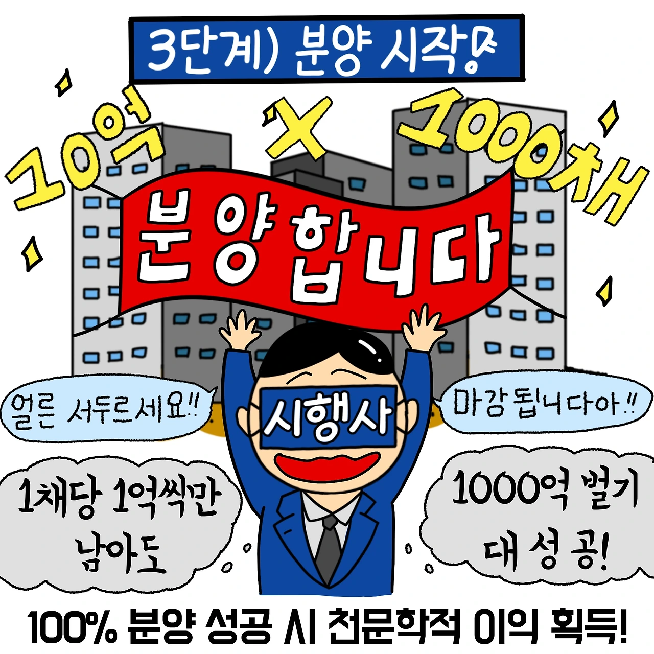 이제 집도 짓겠다! 집에 들어올 사람을 구해야 되겠죠? 분양은 집을 다 짓고 난 후에 할 수 있고, 집을 짓기 시작할 때부터 할 수도 있는데요! 시행사는 본격 분양자를 구하러 나섭니다. 예를 들어 시행사가 짓는 아파트 단지에 약 1000 가구가 들어가고, 집 한 채당 10억이라고 할 경우, 시행사는 100% 분양 성공 시 천문학적인 이익을 획득할 수 있습니다. 부동산 경기가 활황이고, 땅의 위치가 좋을 경우 분양을 시작하자마자 마감되는 경우도 많다고 하는데요! 이렇게 됐을 때, 집을 짓기 위해 들어간 돈도 많지만, 10억짜리 집 1채당 1억씩만 남는다고 가정해도, 시행사는 약 1000억 원을 벌 수 있게 되는 거죠. 다들 이 위험한 사업에 뛰어드는 이유가 있습니다.