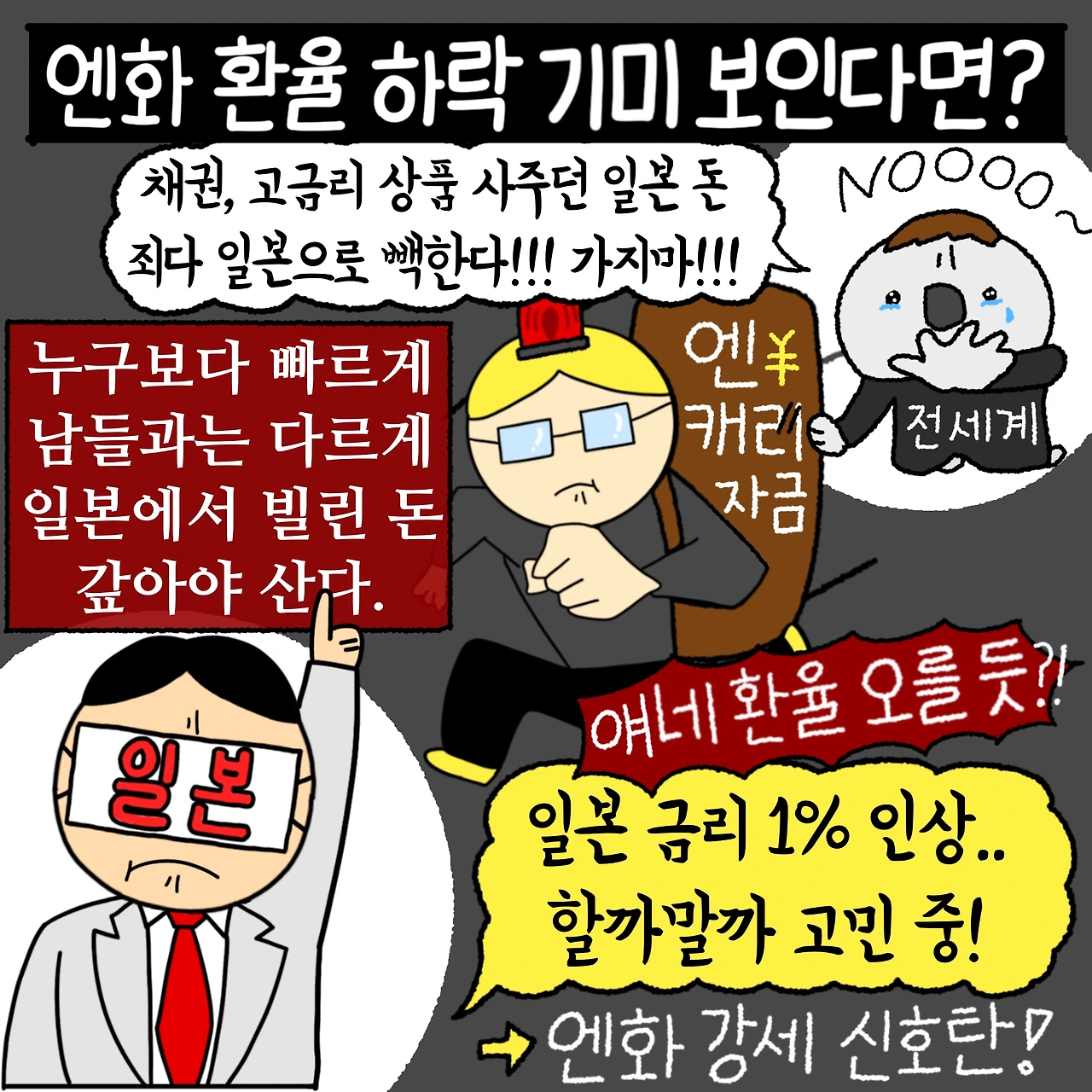 그렇기에 일본의 작은 환율 변동 신호라도 감지된다면, 전 세계에 나가있는 엔 캐리 자금이 한순간에 일본으로 전부 돌아갈 수도 있습니다. 이는 한국을 비롯해 전 세계 경제에 엄청난 변화를 줄 수 있기에, 각국 정부는 일본의 동태를 예의주시할 수밖에 없습니다.