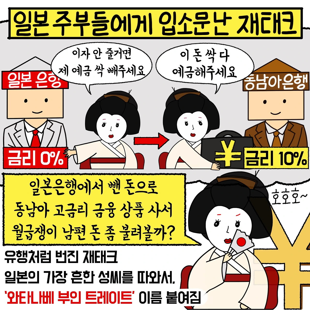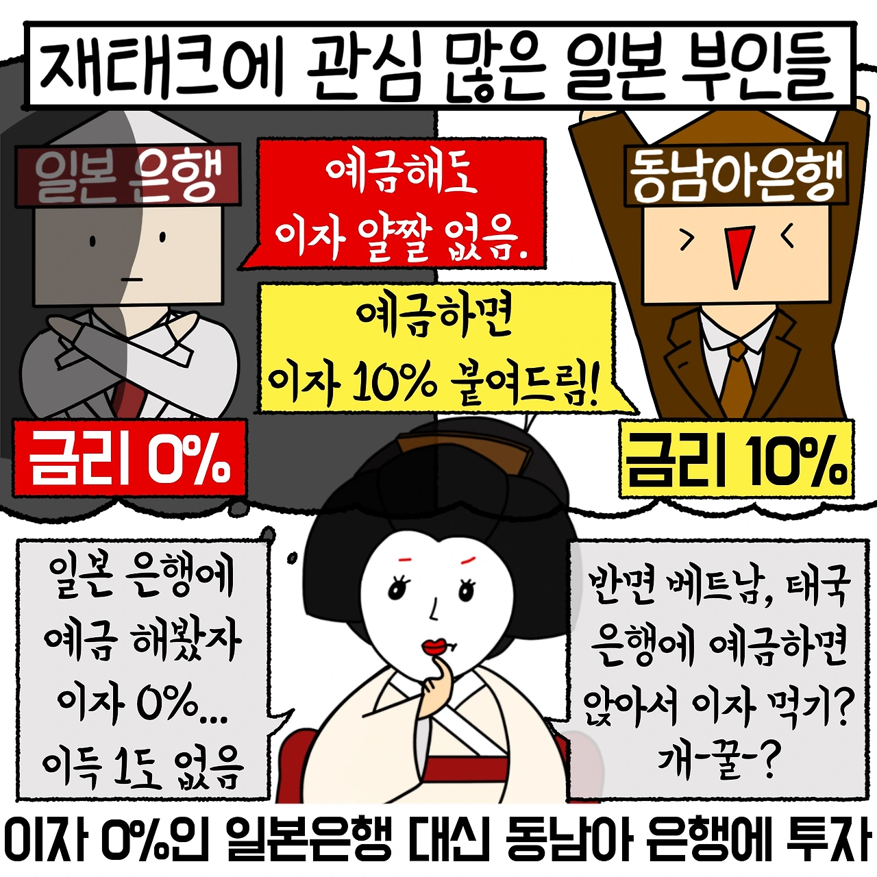 일본 은행에 예금해 봤자 이자를 전혀 받지 못하게 되자, 재테크에 관심 많았던 일본 주부들 사이에서 새로운 재테크 방법이 떠오르게 됩니다. 바로 이자를 안 주는 일본 은행 대신, 이자를 많이 주는 동남아 은행에 예금을 하는 것이었죠. 일본 부인들은 일본 은행에서 대출을 해서, 해외 고금리 예금 상품, 채권, 금 등에 투자하기 시작합니다.