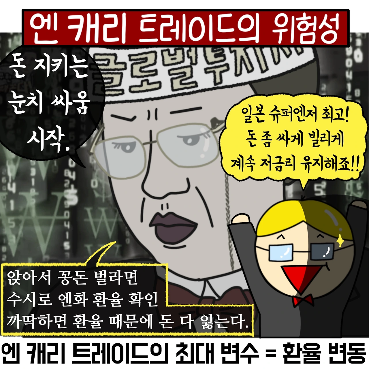 엔화강세(=환율 하락)가 되면, 일본에서 돈을 빌린 투자자들은 일본에 갚을 돈이 늘어나기 때문에 난리가 납니다. 캐리 투자자들이 환율 변동에 민감할 수밖에 이유입니다.
