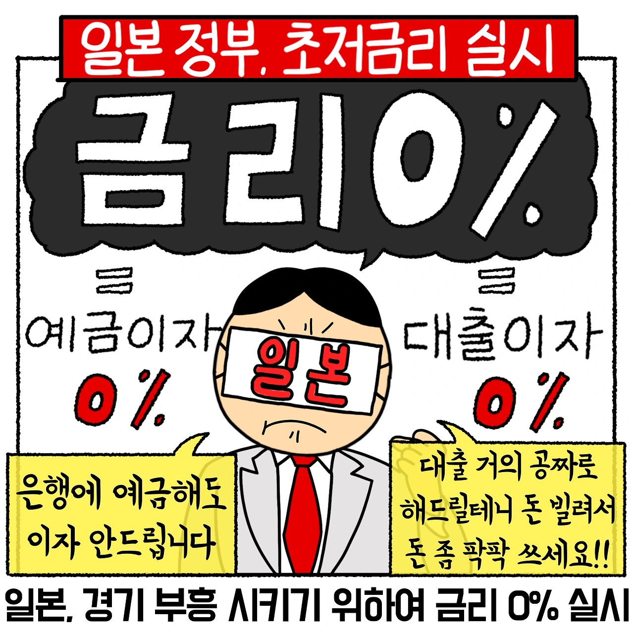 일본 정부는 침체된 경기를 되살리기 위해 “제로금리”를 시행하게 됩니다. 금리를 0%로 유지한 것인데요! 금리는 이자율을 의미합니다. 은행 예금 이자 0%, 은행 대출 이자 0%, 즉 거의 공짜로 대출을 해줌으로써, 은행에 예금하지 말고 대출해서 돈 좀 팍팍 쓰게끔 유도하는 것이죠.