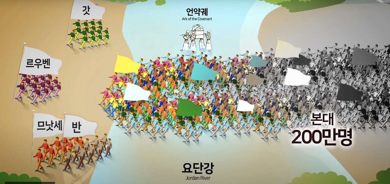 '들어서라' 를 영어성경에서 보면 'Go and stand in the river'이다. 요단강 안에 들어가서 서 있으라는 뜻이다. 제일 먼저 들어간 언약궤 그룹은 강 중앙에 도달했을 때, 사이드에 버티고 서서 본대 200만명까지 모두 건널 때까지 기다려야 했다.