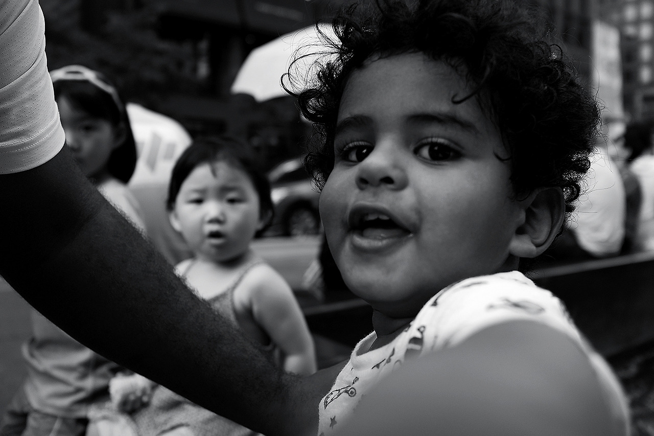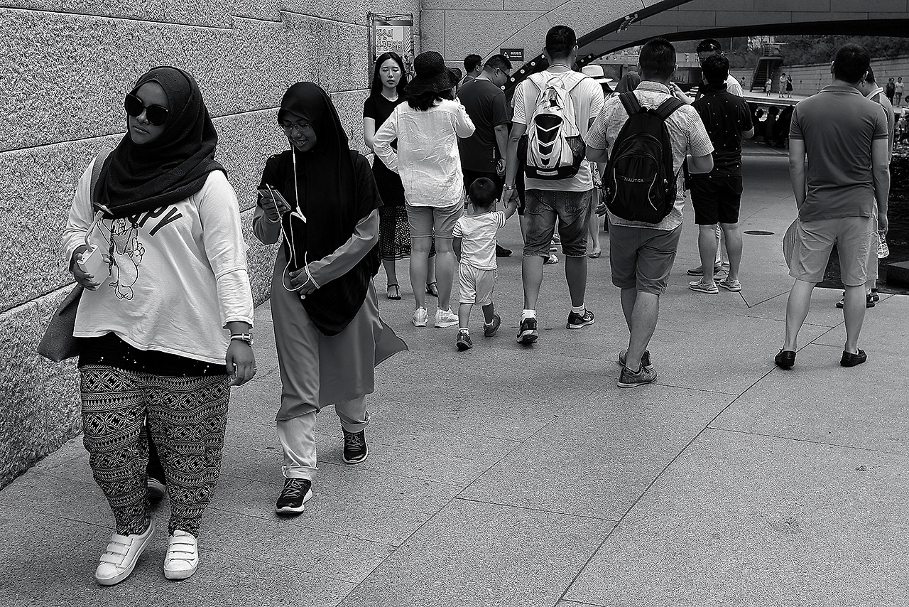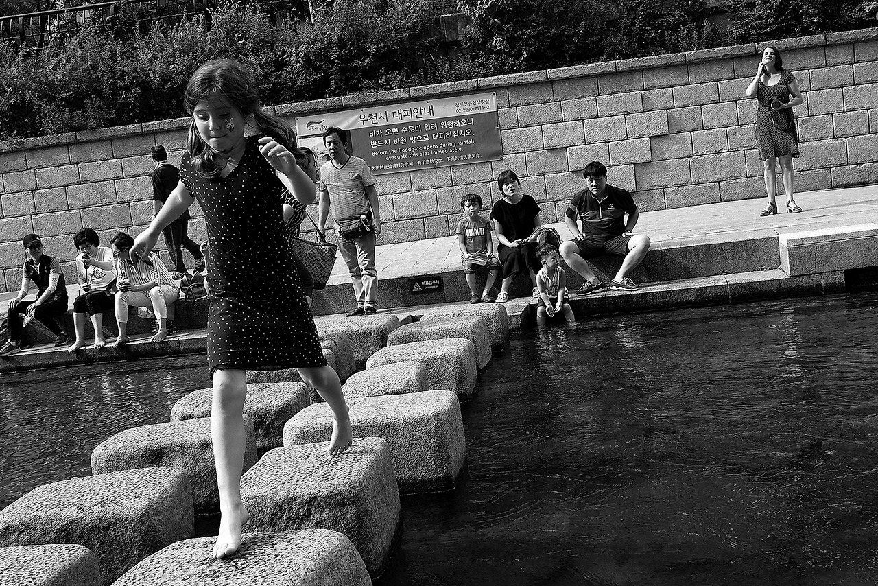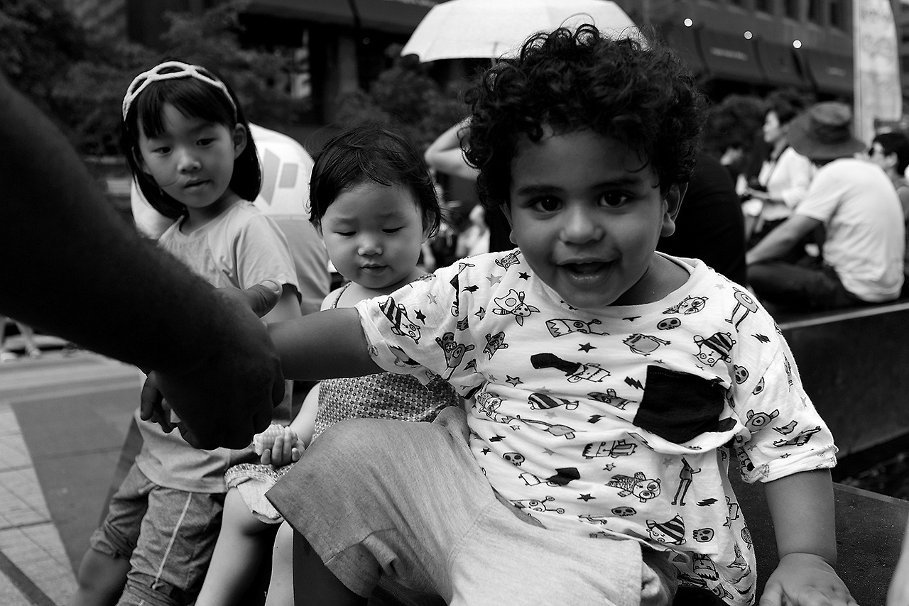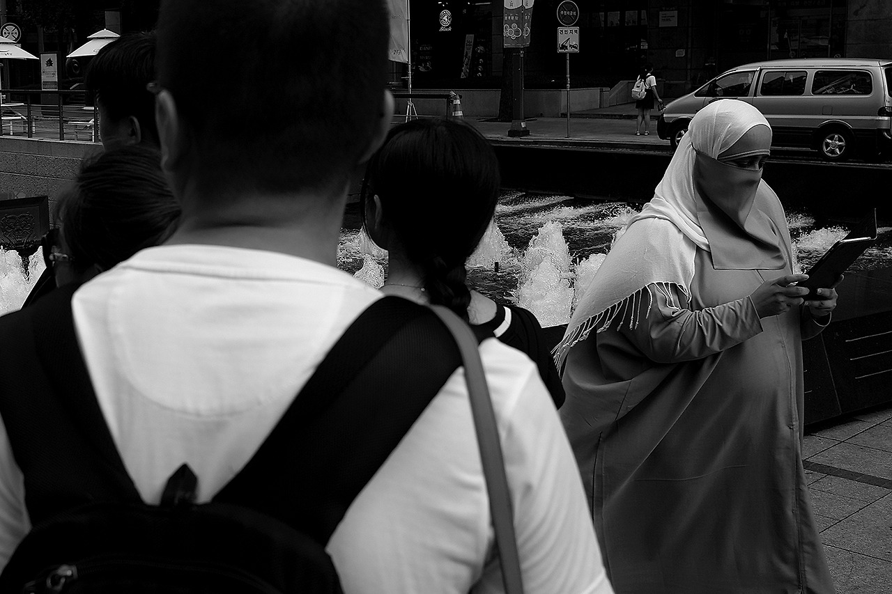 이날의 주인공은 이 아이였습니다. 꼬불꼬불한 머리카락과 깊은 눈, 진한 쌍꺼풀이 참 대조적이죠? 꼬마 뒤에 보이는 우리나라 아이들 표정도 제법 재밌습니다. 처음 청계천에서 외국인들을 찍어봐야겠다고 결심하고 사소한 걱정이 들었습니다. 중국인들만 가득해서 촬영하는 재미가 줄지 않을까 싶었거든요. 기우였습니다. 청계천은 다인종 관광객들의 집합소였으니까요. 히잡(또는 그와 비슷한 국가별 옷차림)을 쓴 이슬람교도들이 특히 인상적이었죠.