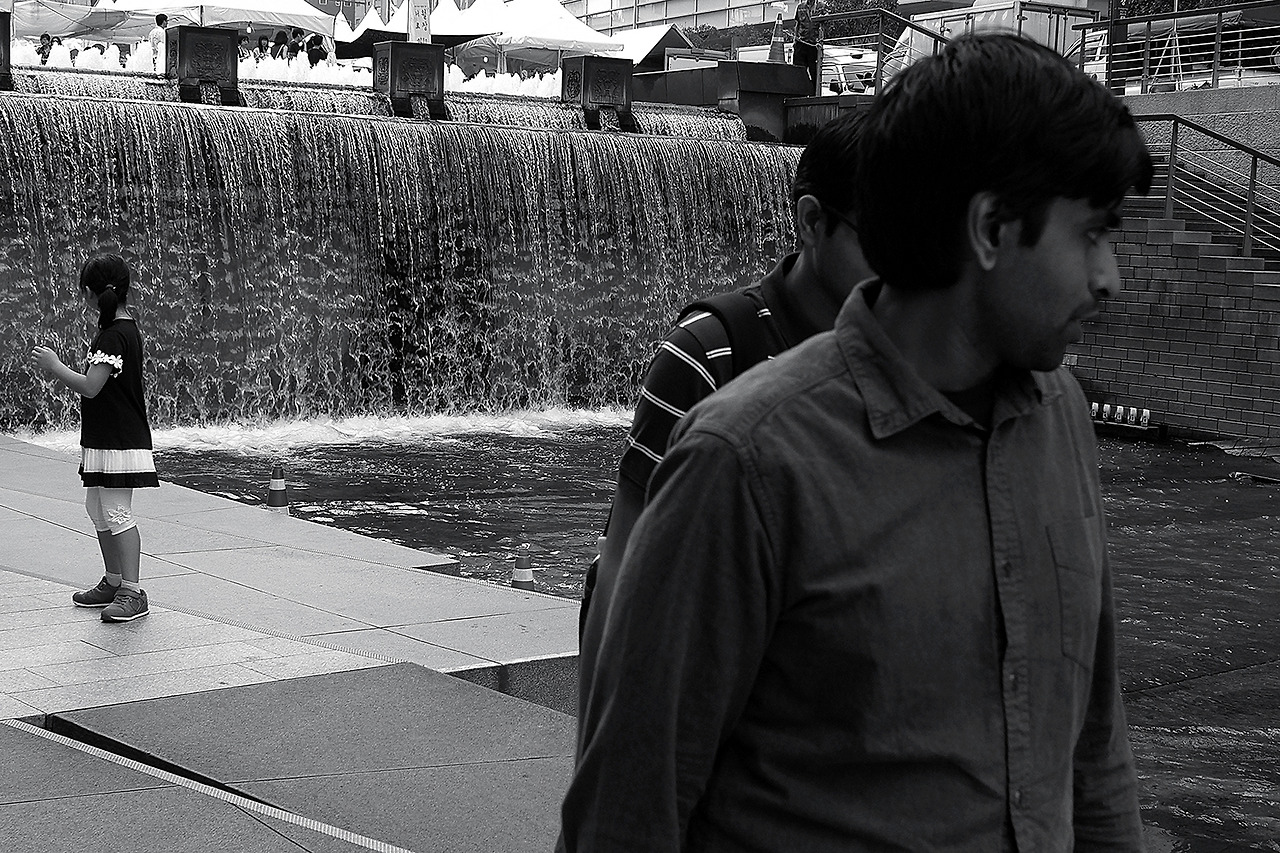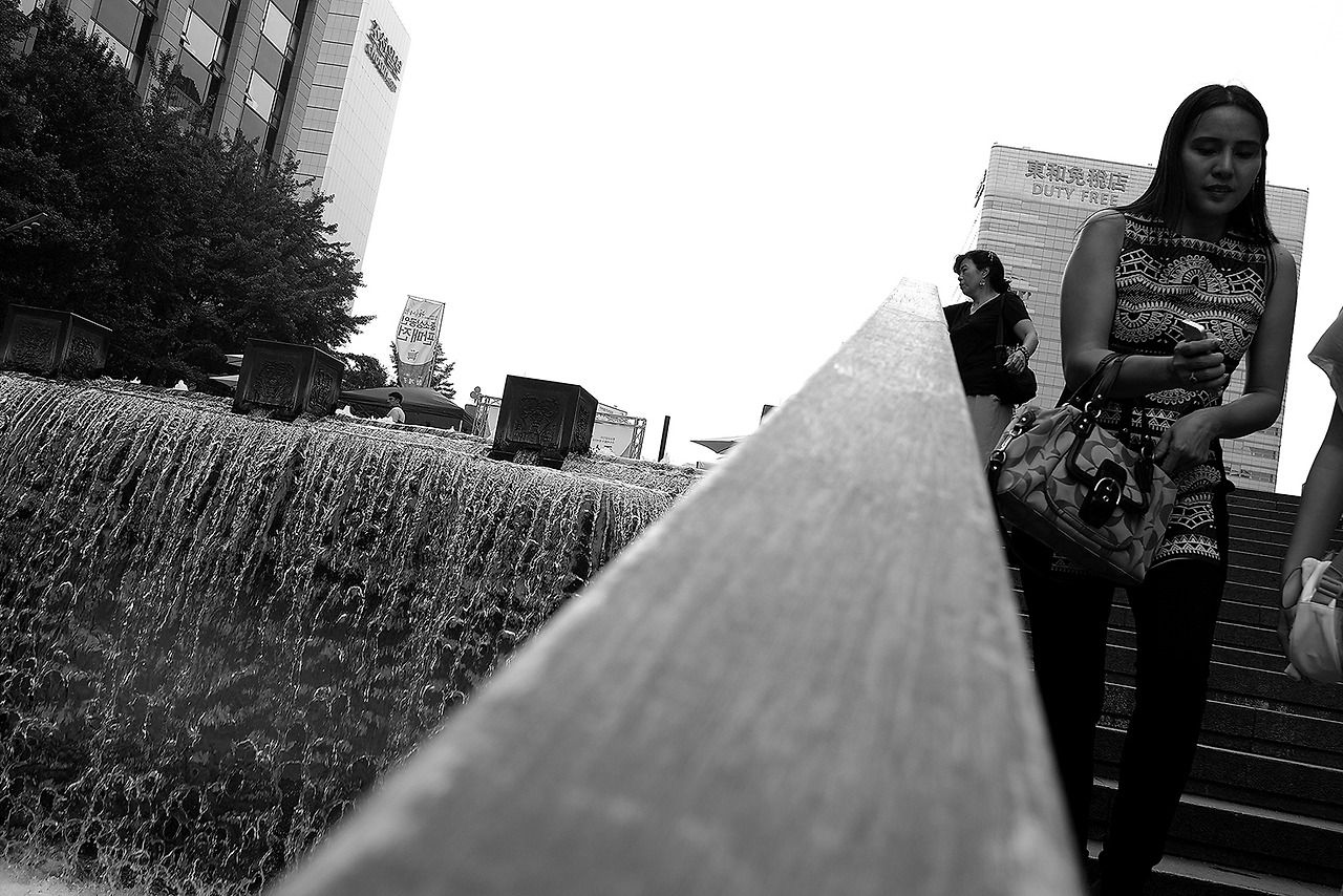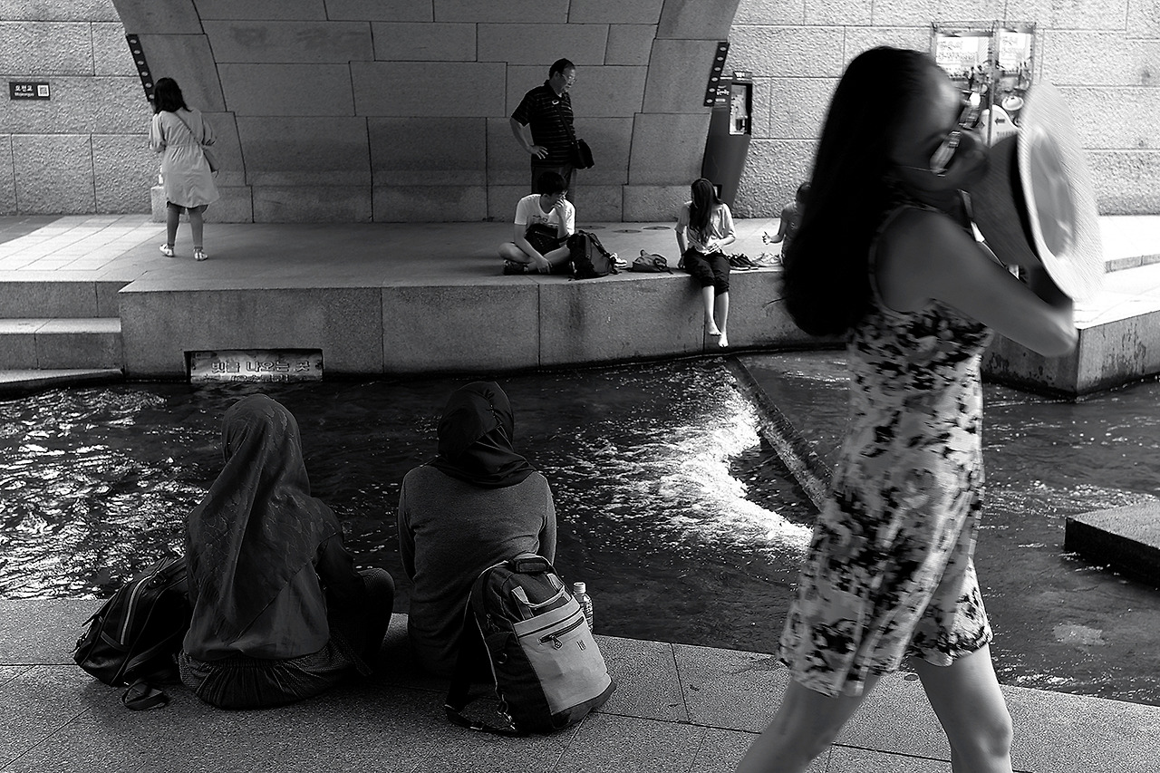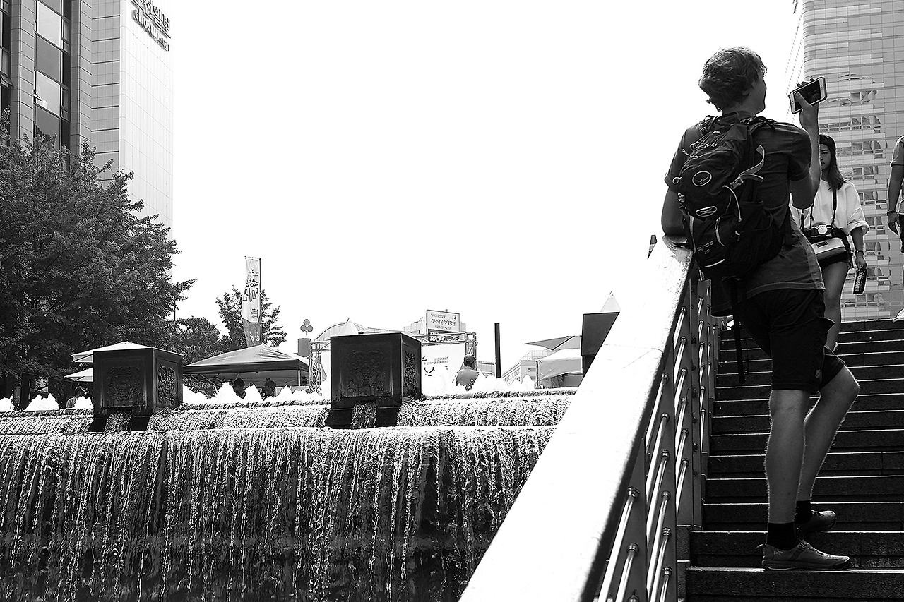 사실 주어진 시간은 많지 않았습니다. 전업 사진가가 아니다 보니 시간의 틈을 찾아내 투자해야 했죠. 2주일 중에 셔터를 누를 수 있는 기회는 딱 3일이었습니다. 평일 오후 한 번, 주말 두 번. 말도 안 되는 무더위였지만 늦게 지는 여름 해는 정말 고마웠습니다. 청계천 초입에 눌러앉아 외국인들을 기다렸습니다. 그들은 시원하게 떨어지는 폭포를 흥미롭게 바라봤습니다. 폭포를 배경으로 기념사진을 찍었고, 산책을 나서기도 했죠. 다만 멀리 가지 않고 다시 빠져나가는 이들이 많아 아쉬웠습니다.