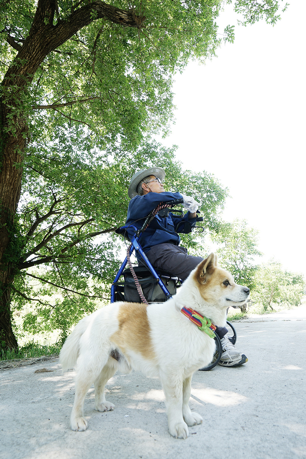 참전 용사답게 근엄한 표정을 지으며 사진 찍으시려는데 똘똘이가 말을 안 듣습니다. 할아버지께서 '앞을 봐라' 거듭 말해도 카메라가 어색한 똘똘이는 뒤로 숨기만 합니다. 결국 할아버지는 줄을 슬쩍 끌고 와 손자가 든 카메라를 바라보게 하십니다. 느슨한 듯 팽팽한 목줄이 짧은 신경전을 보여줍니다.