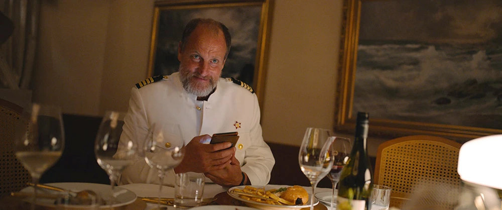 그냥 그런 커리어의 모델 칼(해리스 딕킨슨)과 톱 모델 겸 인플루언서 야야(샬비 딘)은 벌이 차이가 좀 나는 커플입니다. 그러다 보니 돈과 같은 민감한 지점에서 뜻하지 않은 다툼이 일어나기도 하지만, 사랑으로 봉합한 후 초호화 요트 크루즈에 협찬으로 승선합니다. 스스로를 '똥팔이'라 칭하면서 아내와 정부를 양옆에 끼고 다니는 러시아 부자, 세계 평화에 큰 기여를 하는 '수류탄'을 팔아 부를 쌓은 노부부 등 돈으로 자신의 권력을 이룬 사람들이 탑승하여 흔들림 없는 서비스를 받는 이곳은 그야말로 계급화된 사회의 축소판이라 해도 과언이 아닙니다. 그런데 이런 와중에 선장(우디 해럴슨)이라는 사람은 나와보지도 않고 내내 선장실에 틀어박혀서 두문불출하더니만, 악천후가 빤히 예상되는 날에 굳이 선장 주최 만찬을 잡고 정신없이 휘청거리는 만찬장에 승객들을 불러 모아 만찬을 대접합니다. 위태위태하던 만찬장에 멀미를 참지 못한 승객들의 구역질이 난무하면서 비로소 카오스의 문이 열리고, 토사물과 배설물이 뒤엉킨 혼돈의 선상에 갑작스런 사건이 터지며 배는 좌초하고 소수의 승객과 승무원들만 살아남아 무인도에 이릅니다. 크루즈 안에서야 물질이 곧 계급을 결정하는 모든 것이 되었지만, 몸(에 걸친 것)만이 가진 것이고 문명 사회에서의 모든 권력은 무용한 것이 되는 무인도에서 계급의 피라미드는 완전히 재구성됩니다.