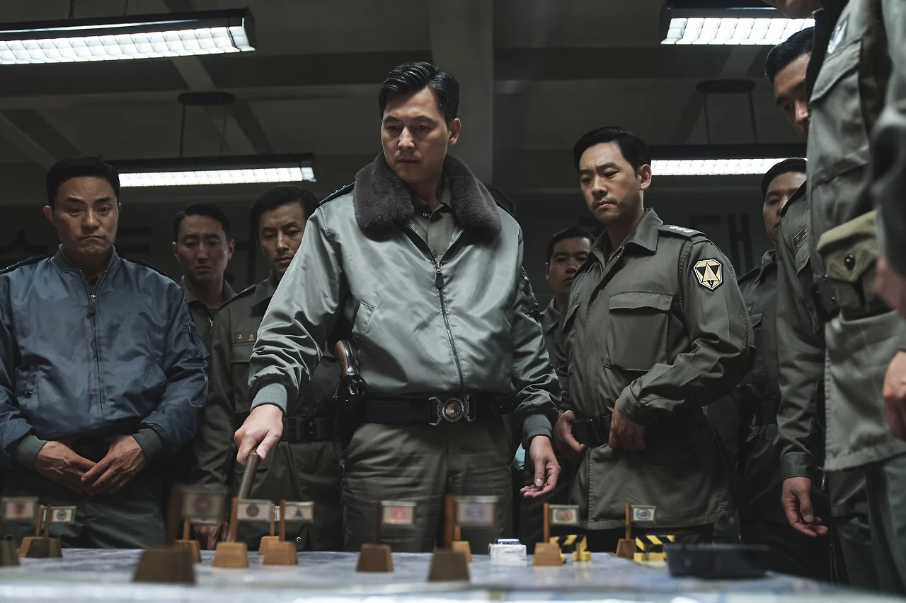 배우들은 그런 인물 묘사의 미션을 몸소 무결점에 가깝게 수행해내며 이른바 '연기 차력쇼'를 펼칩니다. 전두광 역의 황정민 배우는 다음 작품은 정말 선하고 경쾌한 역할이 아니면 안되겠다 싶을 정도로 역사 속 그 인물에 완전히 체화된 연기를 선보입니다. 그가 그려낸 전두광이란 인물은 흡사 뱀처럼 느껴지는데, 자신의 욕망을 위해 세상을 휘어감고 조르고 끝내는 집어삼키려는 욕망을 품고 있다는 점에서 그렇습니다. 선후배를 막론하고 상대를 옴짝달싹못하게 휘어잡는 무시무시한 카리스마를 지니고 있지만 그것마저 어디까지나 자신의 욕망을 실현하기 위한 도구일 뿐인, 리더가 되어 세상을 주무르는 자신의 모습에 한껏 도취된 악인에 지나지 않는 인물의 모습을 황정민 배우는 그야말로 치가 떨리게 연기합니다. 한편 이태신 역의 정우성 배우는 인간으로서 느낄 수 밖에 없는 두려움을 떠안고 사명으로 뛰어드는 강직한 인물을 카리스마 넘치게 그려내며 팽팽한 대립각을 형성합니다. 권력을 탐하지 않고 맡은바 임무에 충실할 뿐인, 자신의 직업적 소명에 투신함으로써 국가의 운명을 걸고 욕망이 충돌하던 현장에서 외려 이상주의자가 되는 인물의 모습을 믿음직스럽게 연기해내죠. 이외에도 올곧은 성격으로 인해 전두광이 일으키는 군사반란의 최초 희생양이 되고 마는 계엄사령관 정상호 역의 이성민 배우, 전두광의 절친한 친구이자 충실한 행동대장이기도 한 노태건 역의 박해준, 절체절명의 순간에마저도 득시글거리는 조직 이기주의 속에서 소신을 지키는 헌병감 김준엽 역의 김성균 배우, 특별출연으로 적은 비중에도 존재감을 빛낸 정만식, 정해인, 이준혁 배우 등 쟁쟁한 배우들이 사건의 면면을 채웠던 실존 인물들의 초상을 힘있게 그려나가며 영화를 풍성하고 촘촘하게 채워나갑니다.