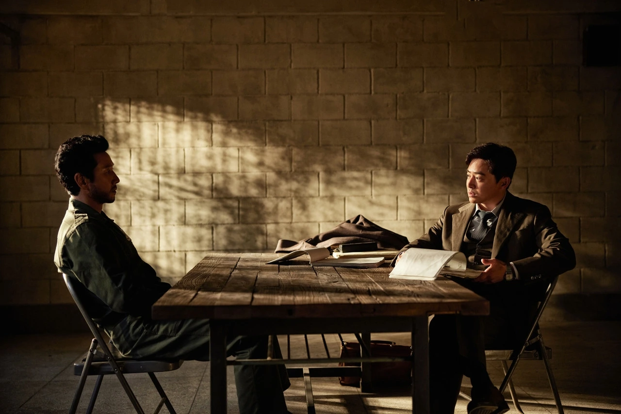 그런 가운데 때론 뜨겁게, 때론 차갑게, 하지만 하나같이 격렬하게 부딪히는 배우들의 개성 뚜렷한 연기가 인상적입니다. 정인후 역의 조정석 배우는 현재 전혀 상반된 스타일의 연기를 보여준 영화가 인기리에 상영되고 있는데도, 그 영화 속 코믹 연기가 전혀 떠오르지 않을 만큼 무거운 역사의 한 장면을 품은 정극의 무게를 고스란히 살려냅니다. 작품을 막론하고 꾸준히 볼 수 있었던 특유의 톤이 이번에도 느껴진다 싶다가도 그것이 자칫 도식적으로 그려질 수 있는 영화 속 정인후라는 인물에 오히려 현실성을 불어넣는 역할을 하며, 후반부로 갈수록 인물에 절절한 힘을 부여합니다. 한편 그와는 정반대로 힘을 한껏 뺀 채로 인물의 굳은 심지를 연기하는 이선균 배우의 연기는, 이 영화가 그의 연기를 볼 수 있는 마지막 작품이어서 그런지 더 짙은 여운을 남겼습니다. 조정석 배우와 그가 마주 앉은 장면을 볼 때면 이미 지나간 시간 속 인물과 현재의 인물이 마주 앉은 느낌마저 들었습니다. (그래서 정인후가 과거 속 현장에 던져진 현재의 인물로서 더 잘 느껴졌는지도 모르겠습니다.) 무엇보다 합수부의 우두머리이자 영화 속 '악의 근원'인 전상두를 연기한 유재명 배우를 언급하지 않을 수 없습니다. '서울의 봄' 속 전두광과 달리 싸늘하고 냉혹한 얼음장 같은 터치로 전상두를 그려내는 유재명 배우의 살벌하면서도 섬세한 캐릭터 묘사는 다른 배우와 비교될지언정 전혀 뒤지지는 않을 존재감을 남깁니다.