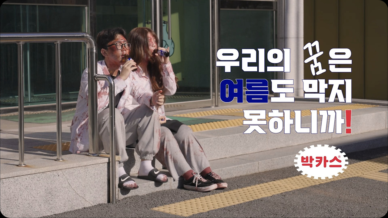 좀비들에 의해 점령당한 학교. 아직 살아남은 학생들이 좀비들의 눈을 피해 교실 밖으로 나오려는데, 실수로 박카스 병을 찬 소리에 의해 좀비들에게 위치가 들키고 이내 전력으로 달아나던 도중 '컷' 소리가 들려옵니다. 알고보니 학생들이 학교에서 좀비영화를 찍고 있었던 것. 친구들은 쉬는 시간에 박카스 한 병을 마시며 더위도 막지 못하는 청춘을 만끽합니다. 학교 배경 좀비영화의 이미지를 세련되게 연출하는 한편, 이를 치열한 청춘의 현장으로 전환시키며 더위에 굴복할 수 없는 꿈의 이미지를 박카스와 유쾌하게 결합시킵니다.