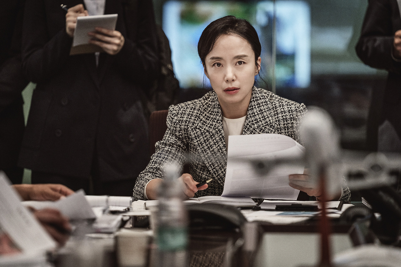 이쯤 되니 아주 특출나게 신선하진 않은 재난영화 같았던 이 영화에 왜 이렇게 쟁쟁한 배우들이 모여들었는지 짐작이 됩니다. 모두가 각기 다른 위치에서 자기의 역할을 수행하는 보통의 사회 구성원들이지만 저마다 분명한 신념을 지니고 있기 때문이죠. 베테랑 형사 팀장 인호 역의 송강호 배우는 힘을 뺀 예의 생활 연기 속에서도 경찰이자 가장으로서의 투철한 의지를 거창한 다짐이나 선언이 아니라도 당연한 도리인 듯 피력하는 그의 모습은 보통의 인간애를 지닌 소시민으로서 신뢰감을 줍니다. 딸을 둔 아버지 재혁 역의 이병헌 배우 역시 명불허전의 생활 연기를 보여주는데, 딸 앞에서는 든든한 아버지이고 싶으나 내면의 두려움 앞에 쩔쩔 매는 모습에서 느껴지는 소심함이 심적 성장 이후 비장함으로 변화하는 과정에 설득력을 부여합니다. 아주 눈에 띄거나 하지 않아도 자기 자리에서 주어진 사명에 침착히 최선을 다하는 이들의 모습을 믿음직하게 보여주는, 국토부 장관 숙희 역의 전도연 배우와 부기장 파일럿 현수 역의 김남길 배우 또한 영화에 안정감을 주었습니다. 더불어 테러리스트 진석을 연기한 임시완 배우의 '돌아 있는' 연기는 첫 등장부터 신경을 곤두세우게 할 만큼 대단했는데요, 영화의 극적 전개를 위해 과장되게 그려진 빌런이 아니라 현실에서도 누군가 이처럼 뱀같이 스며들어 누비고 있을 것만 같은, 이해할 수 없는 증오와 반항심으로 똘똘 뭉친 자의 얼굴과 말과 행동을 실감나게 구현했습니다.