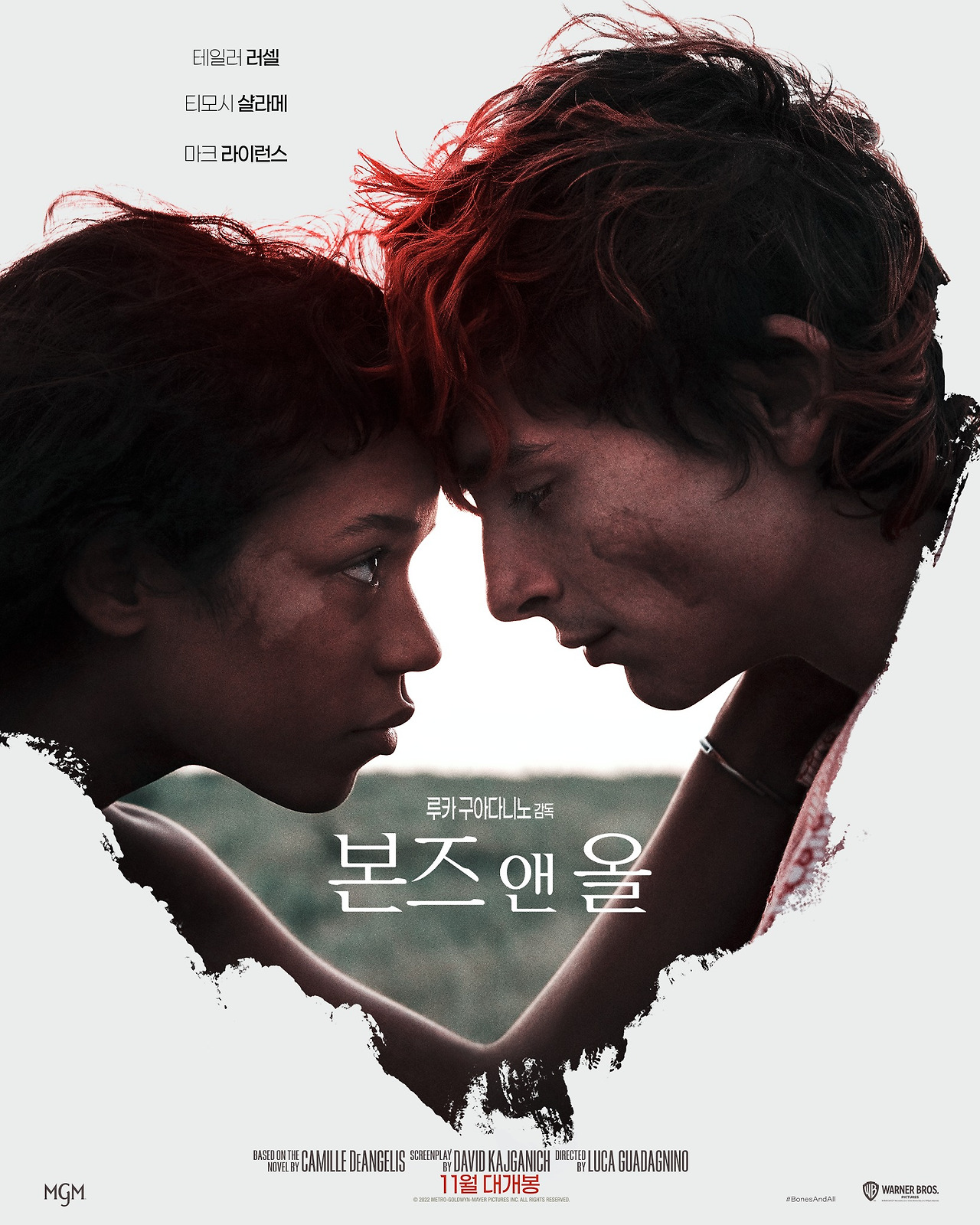 <본즈 앤 올>은 흥건한 피를 보면서도 반짝이는 사랑을 느끼게 되는 기이하고 매혹적인 경험을 선사하는 영화입니다. 청춘이라는 축복이자 통과의례의 시간 속엔 가장 고통스럽고 혼란스럽지만 동시에 철저히 우리만의 것일 수 밖에 없는 불안과 방황이 존재합니다. 막을 수 없는 욕망과 그 결과 흥건하게 번지는 피는 마치 그 불안과 방황의 여파를 투영하는 듯 하지만, 그 피칠갑을 하고도 서로를 '본즈 앤 올', 즉 '뼈까지 다' 갈망하는 연인의 모습에선 일말의 찬란한 순간이 엿보이는 듯 합니다. 한 가지 색깔의 감수성으로 정의할 수 없이 없는 셈 치고픈 고통과 영원히 간직하고픈 환희가 함께 하는, 긴장을 놓을 수 없는 이야기 속에서 피어나는 빛나는 사랑을 목격하며 이것이 바로 청춘임을 실감하게 하는 <본즈 앤 올>은 대담한 접근과 사려깊은 시선을 동반하여 완성된 청춘의 강렬한 초상과 같은 영화입니다.