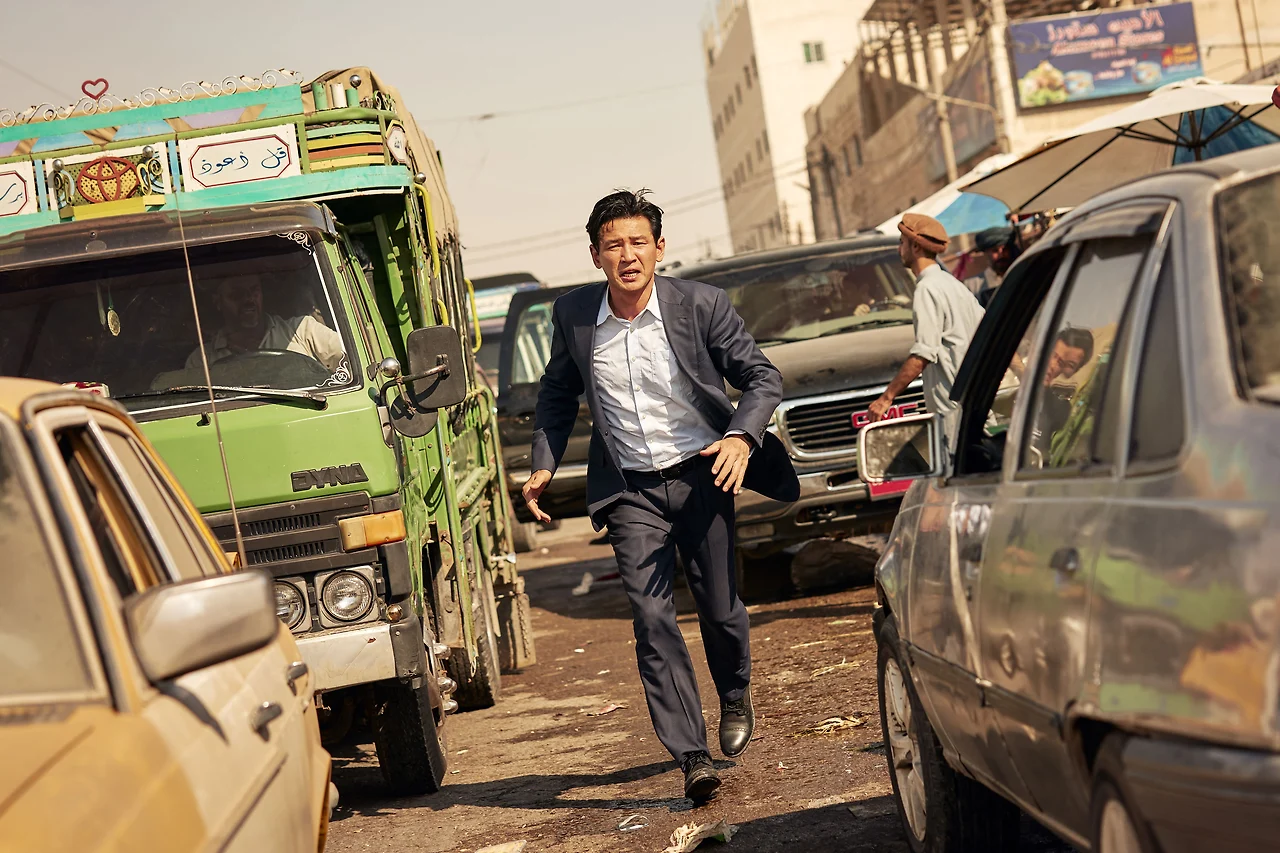 이런 제약 속에서 배우들은 강한 인상을 남기는 데에는 한계가 있었던 와중에도 영화의 중심을 잡아주었습니다. 외교통상부의 전문교섭관 재호 역의 황정민 배우는 역할에 걸맞게 감정과 행동보다는 이성과 논리로 상황을 돌파해 나가려는 인물의 고뇌와 결단을 강인하게 그려내며 영화의 축을 단단하게 형성하였습니다. 영화는 제목에 걸맞게 클라이맥스를 액션을 동반한 화려한 눈요기가 아닌 인물과 인물의 대면 협상으로 장식하는데, 말 한마디에 상황이 완전히 뒤바뀔 수 있는 위험천만한 상황 속에서 책임감을 바탕삼아 불안을 뚫고 나오는 대범함을 설득력 있게 보여줍니다. 한편 국정원 현지 요원 대식 역의 현빈 배우는 황정민 배우가 미처 보여줄 수 없는 액션과 감정 부분을 충실히 소화합니다. 영화에서 많지 않는 액션 장면들에서 예의 활약을 보여주는 한편, 대식의 개인사에 깃든 우수어린 감정도 만족스럽게 표현하죠. 한편 통역사 카심 역의 강기영 배우는 적정 수준의 유머 코드로 극에 부드러움을 더하는 한편, 통역사라는 역할에 걸맞게 말이 오가는 과정에서 생겨나는 긴장감을 증폭시키는 역할도 수행하며 황정민-현빈 배우 사이에서 좋은 균형추 역할을 합니다.