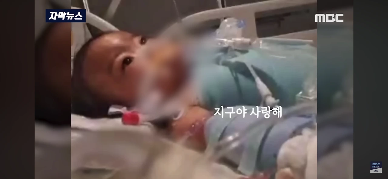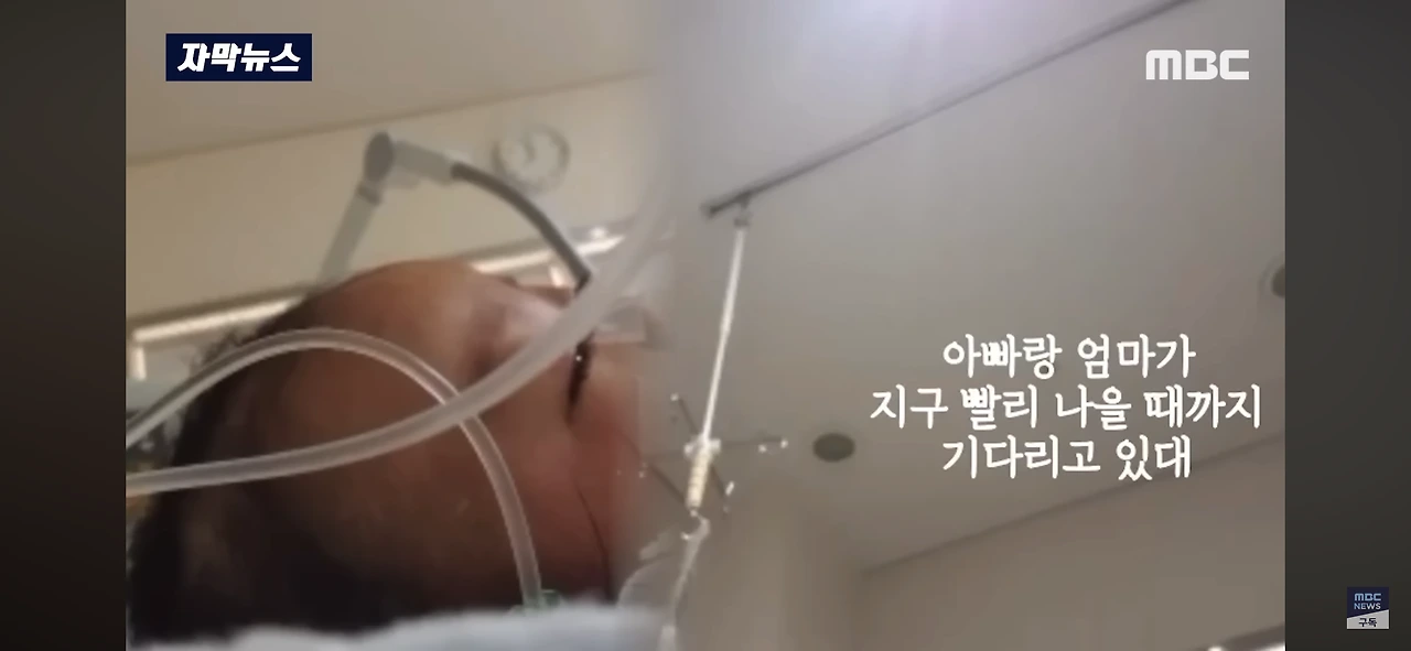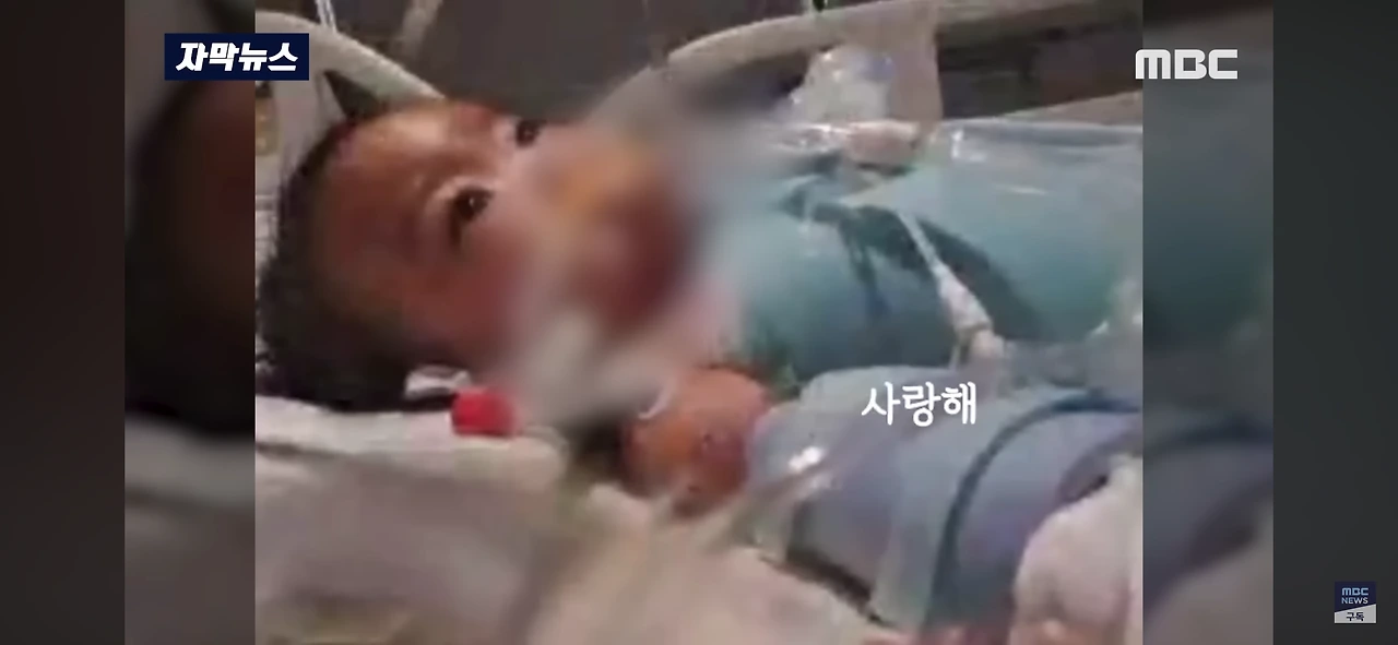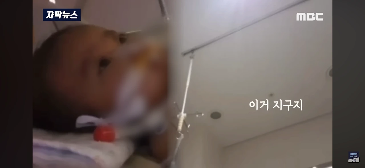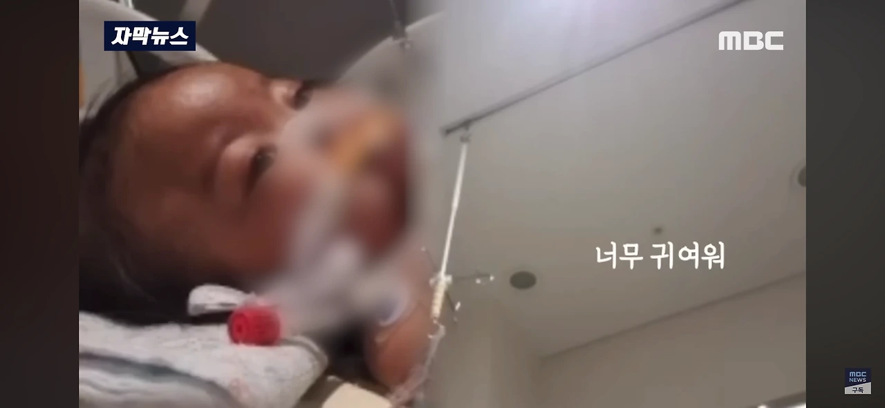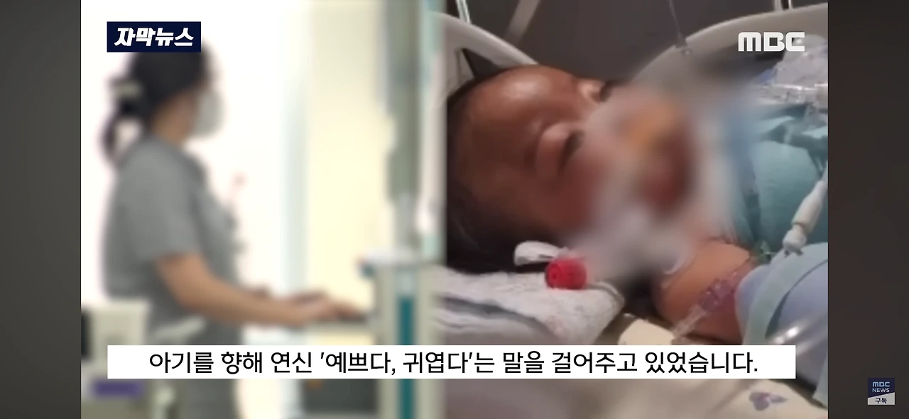 온몸에 호스를 꽂은 아기가 중환자실에 누워,