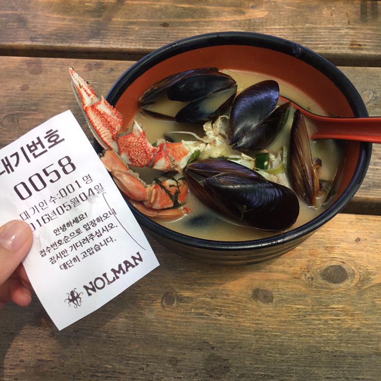 KBS <슈퍼맨이 돌아왔다>에서 하루가 아주 맛있게 먹었던 놀멘 해물라면. 간판에는 살아있는 듯한 문어가 그려져 있는데 아쉽게도 라면에는 전혀 들어있지 않다. 하지만 가격대비(한 그릇 6,000원) 꽤나 신선하고 맛 좋은 다른 해산물이 들어있었다. 맛은 유명세만큼 대단하지는 않았는데, 굳이 따지자면 시판되는 나가사키 짬뽕과 비슷한 맛. 다행히 점심시간이 살짝 지나 대기 없이 바로 먹을 수 있었다.