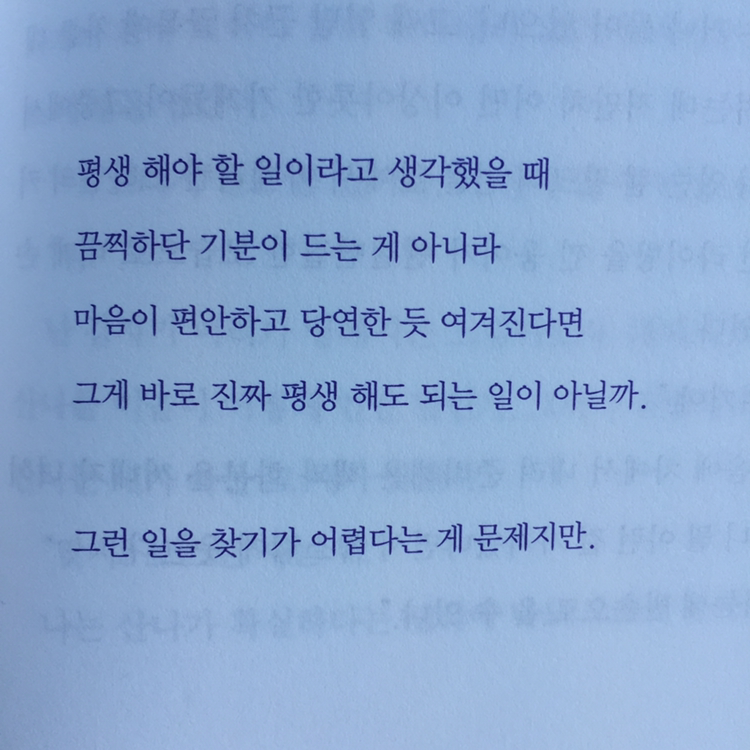 직업과 직장에 대한 고민을 안고 떠난 여행 중에 예상치 못한 책에서 예상치 못한 해답을 얻었다. 그래서 그런 일은 어떻게 어디에서 찾을 수 있단 말인가 싶었지만, 그래도 그런 일을 만난다면 이게 내 일이구나 정확히 알아볼 수는 있겠다.
