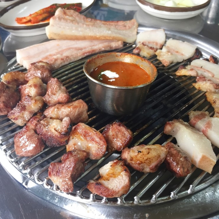 달랑 감귤주스 한 잔을 마시고 등산(?)을 했으니 몹시 배가 고프다. 오늘은 무조건 흑돼지 구이를 먹기로 하고, 네비에 제일 가까운 칠돈가를 찍었다. 점심시간이 살짝 지난 애매한 시간, 늘 대기줄이 늘어서 있는 곳이지만 다행이 바로 식사를 할 수 있었다. 이번 여행은 뭐든 잘 풀리는 기분이다. 하지만 대기줄이 길었더라도 좀 기다리고 먹지 뭐~ 어차피 시간은 많고 할 일도 없는데! 했을 우리.