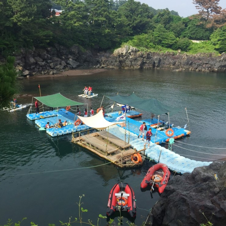 바로 해변에서 술을 마시기에는 너무 대낮이라 근처 쇠소깍에 들렀다. 하지만 우리의 목적은 월정리 해변에서 마시는 와인에 있다. 시간이 맞으면 쇠소깍을 운행하는 나무 뗏목을 타고 싶었는데 휴가철인지라 한참 뒤의 뗏목만 자리가 있었다. 투명 카약도 자전거 보트도 모두 예약이 꽉 찼다. 아쉬웠다.