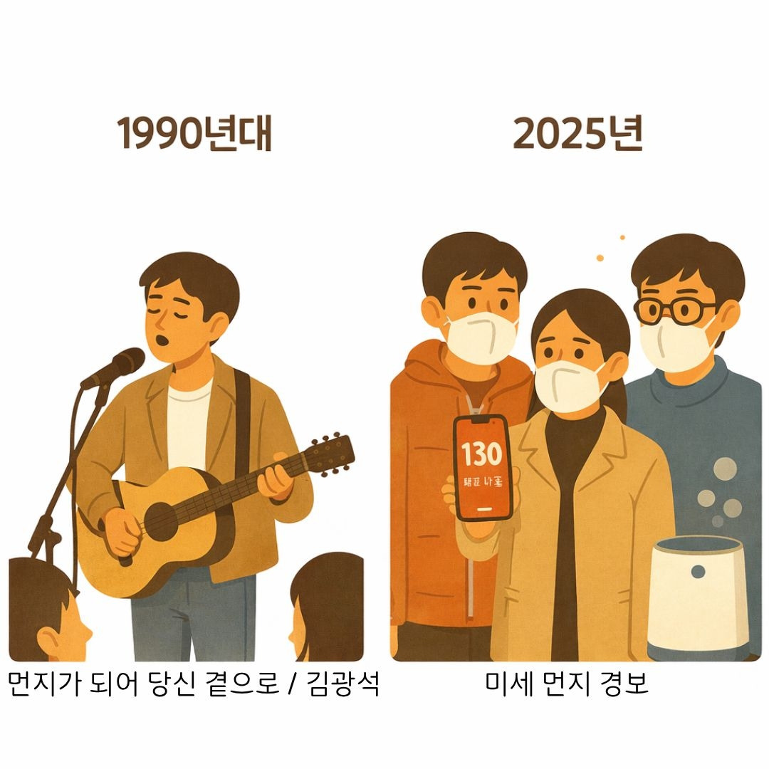 김광석의 목소리가 울려퍼지던 1990년대 어느 작은 무대. "먼지가 되어"라는 간절한 속삭임 속에서, 사라짐은 아름다운 체념이자 낭만적 갈망이었다. 그 시절의 먼지는 순수한 시였다. 햇빛이 창틈을 비스듬히 가로지를 때 춤추는 미세한 입자들, 그것들은 기침을 만드는 침입자가 아니라 빛과 어우러진 자연의 서정시였다.